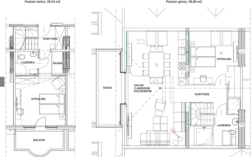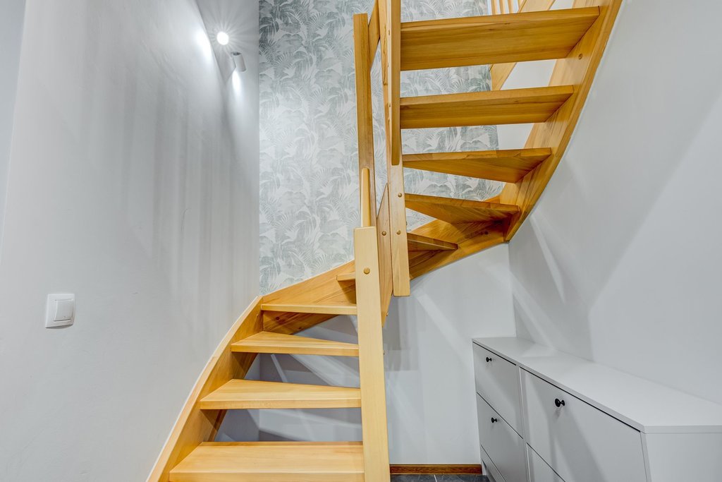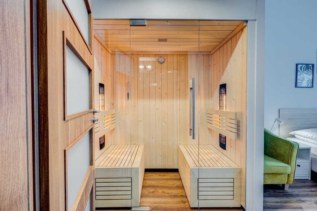 - na 1. poziomie przedpokój z szafą w zabudowie i szafkami na obuwie, holl, sauna na podczerwień, sypialnia z balkonem, łazienka z wc,