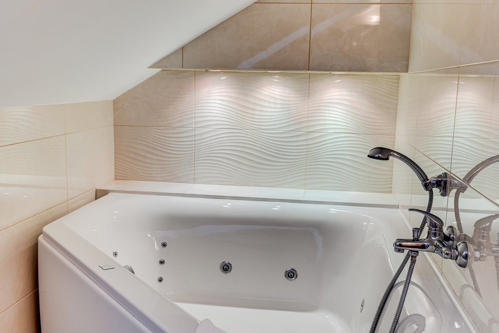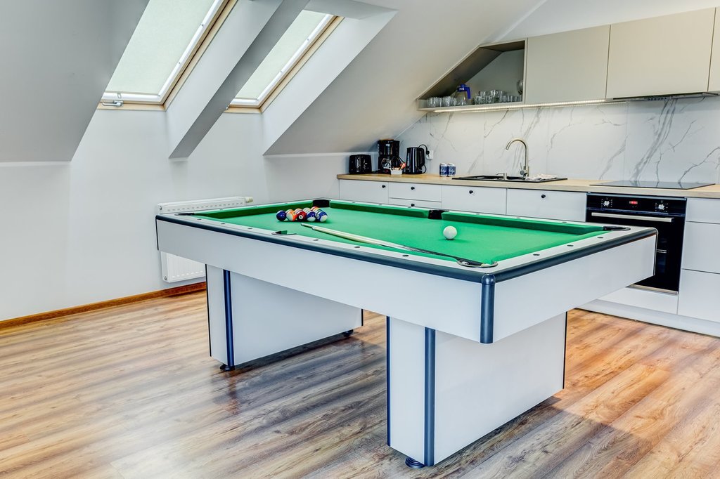 Apartament jest pięknie zaprojektowany oraz komfortowo wykończony i wyposażony m.in. w saunę, wannę z hydromasażem, stół bilardowy.