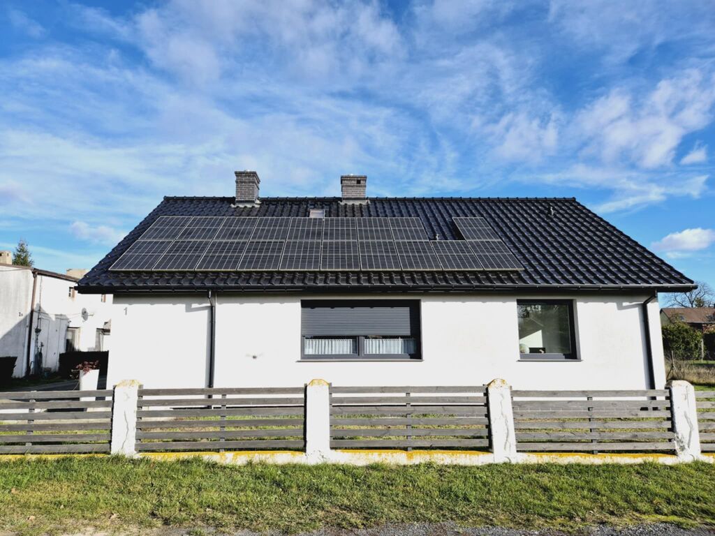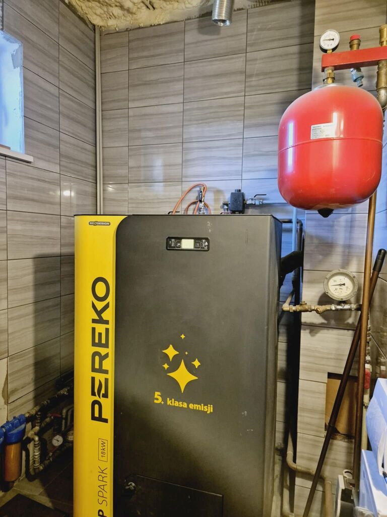 Ogrzewanie domu z pieca na pelet, ponadto na dachu zainstalowane panele woltaiczne oraz kominiek. Woda ogrzewana z pieca.