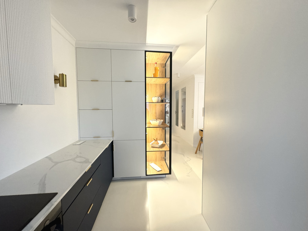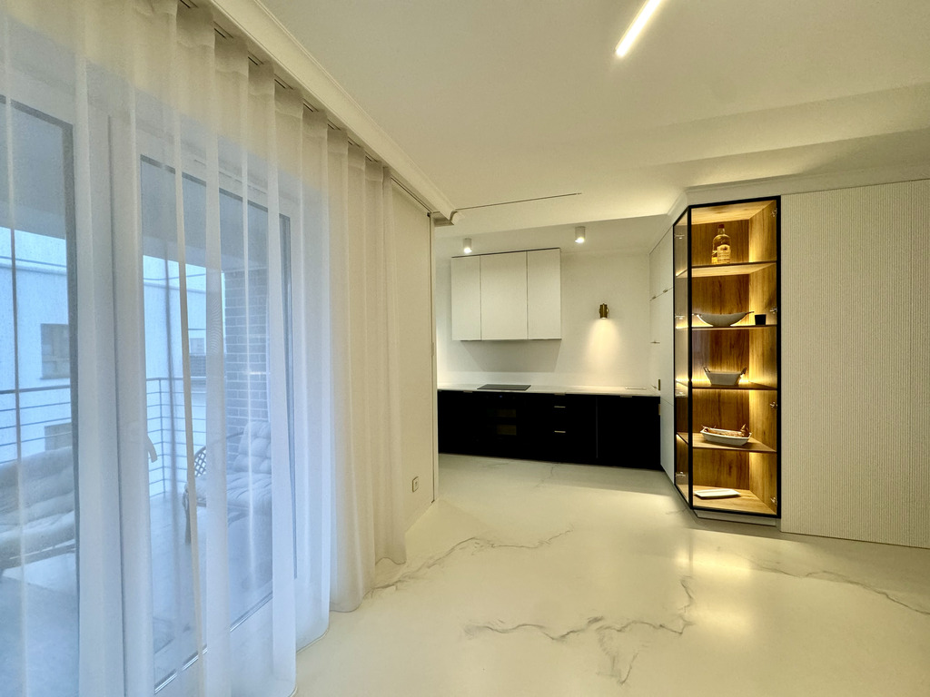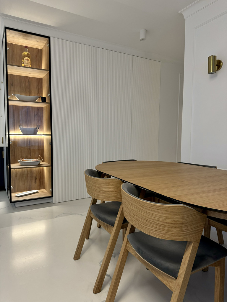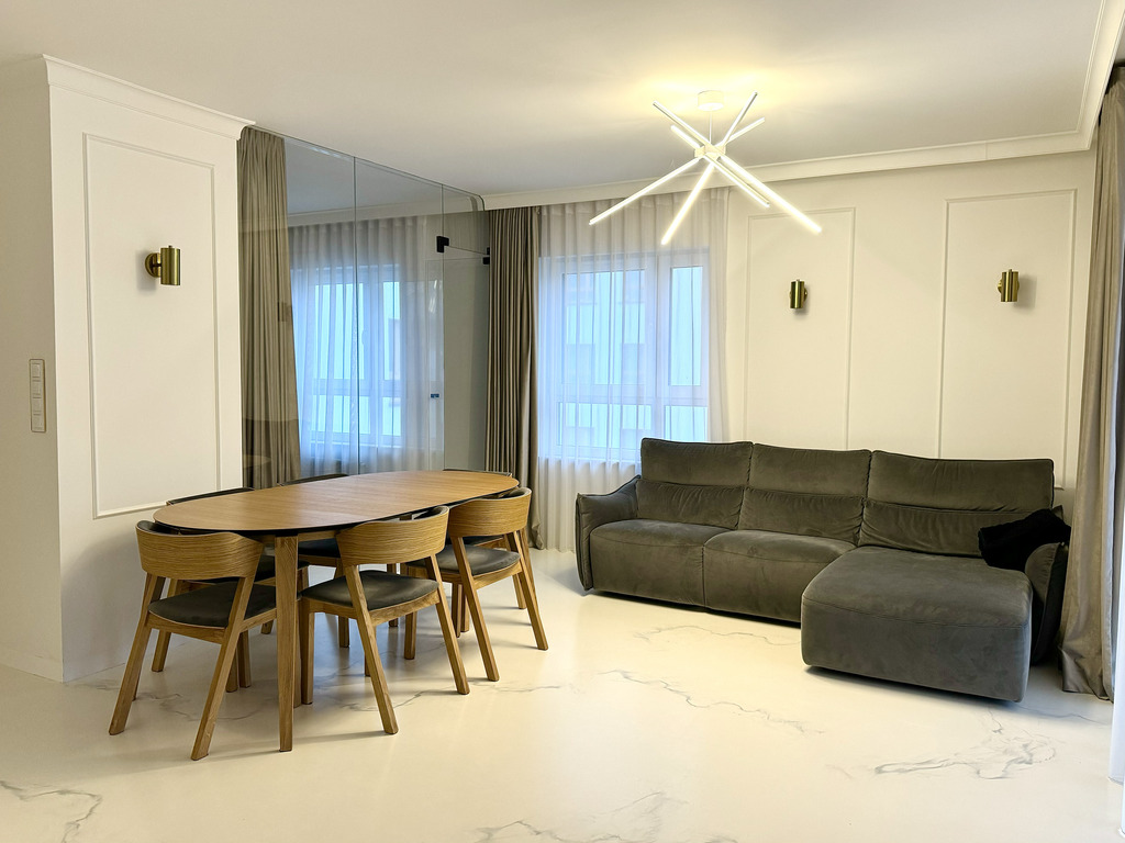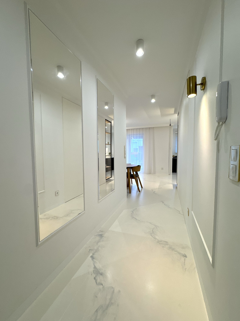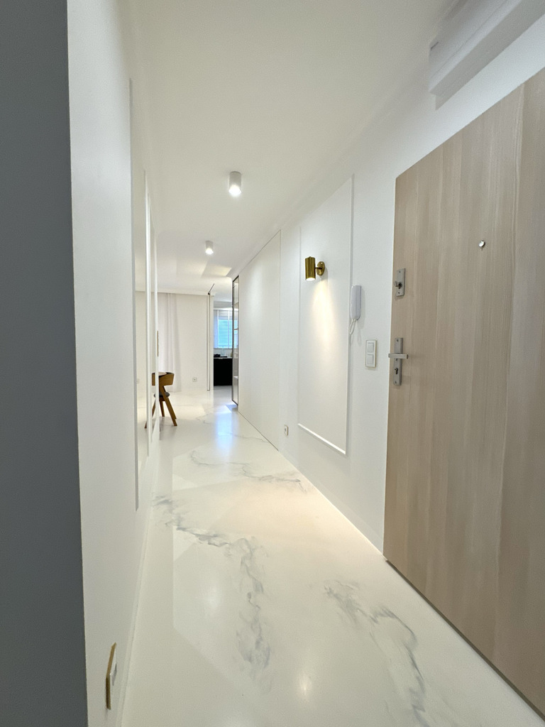 Całość mieszkania dopełnia designerskie oświetlenie i detale takie jak ukryte listwy przypodłogowe, ozdobne listwy ścienne i sufitowe, podłogi z żywicy antyalergicznej, drzwi do pomieszczeń zlicowane ze ścianą.