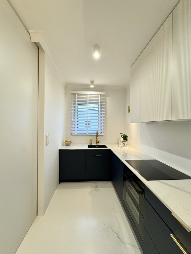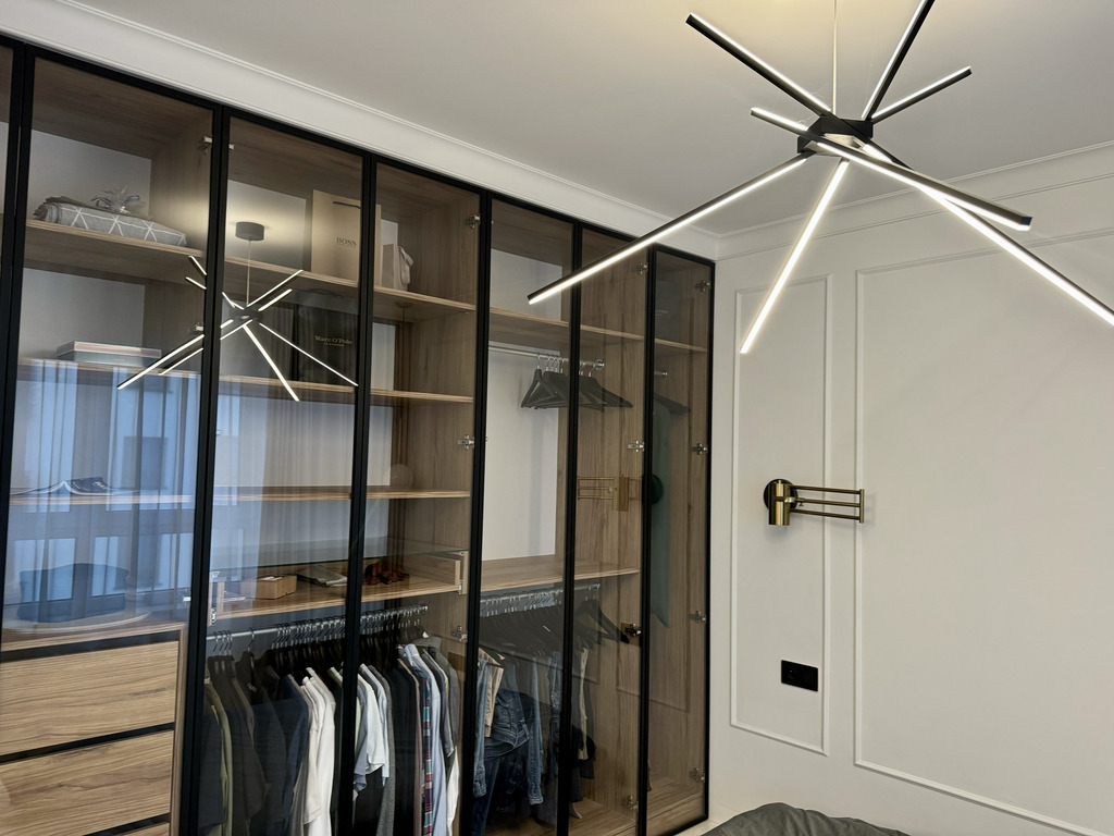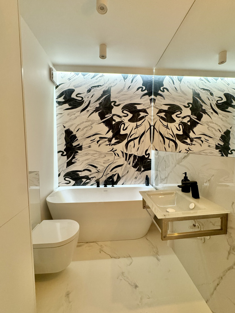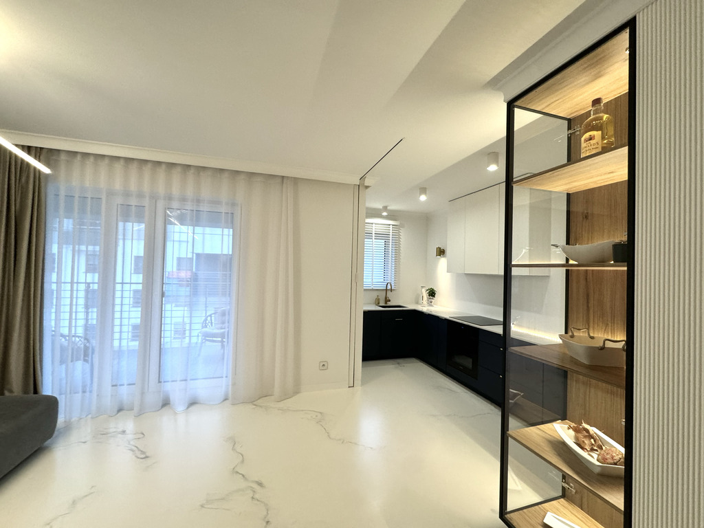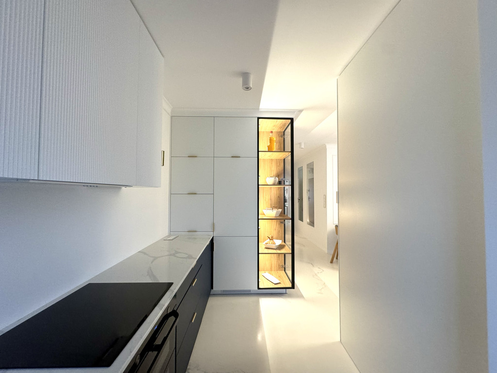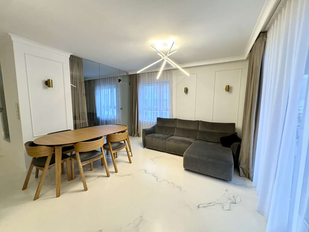 Całość mieszkania dopełnia designerskie oświetlenie i detale takie jak ukryte listwy przypodłogowe, ozdobne listwy ścienne i sufitowe, podłogi z żywicy antyalergicznej, drzwi do pomieszczeń zlicowane ze ścianą.