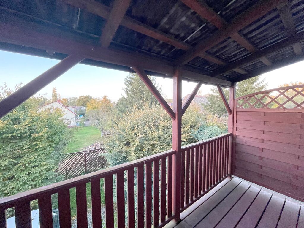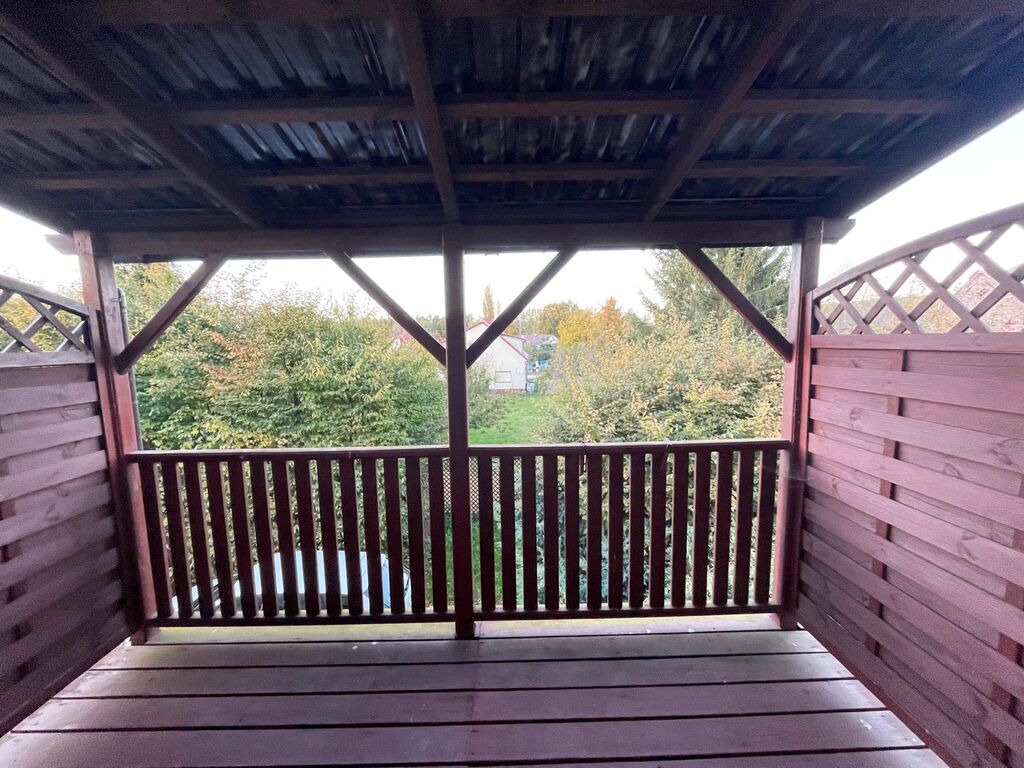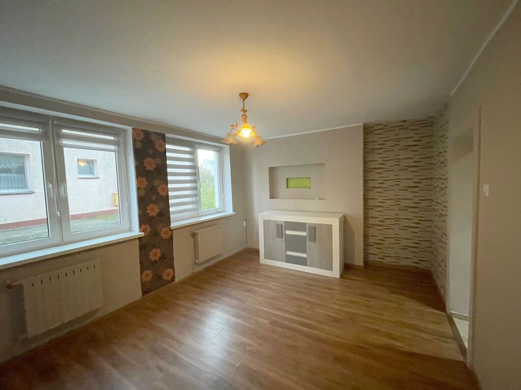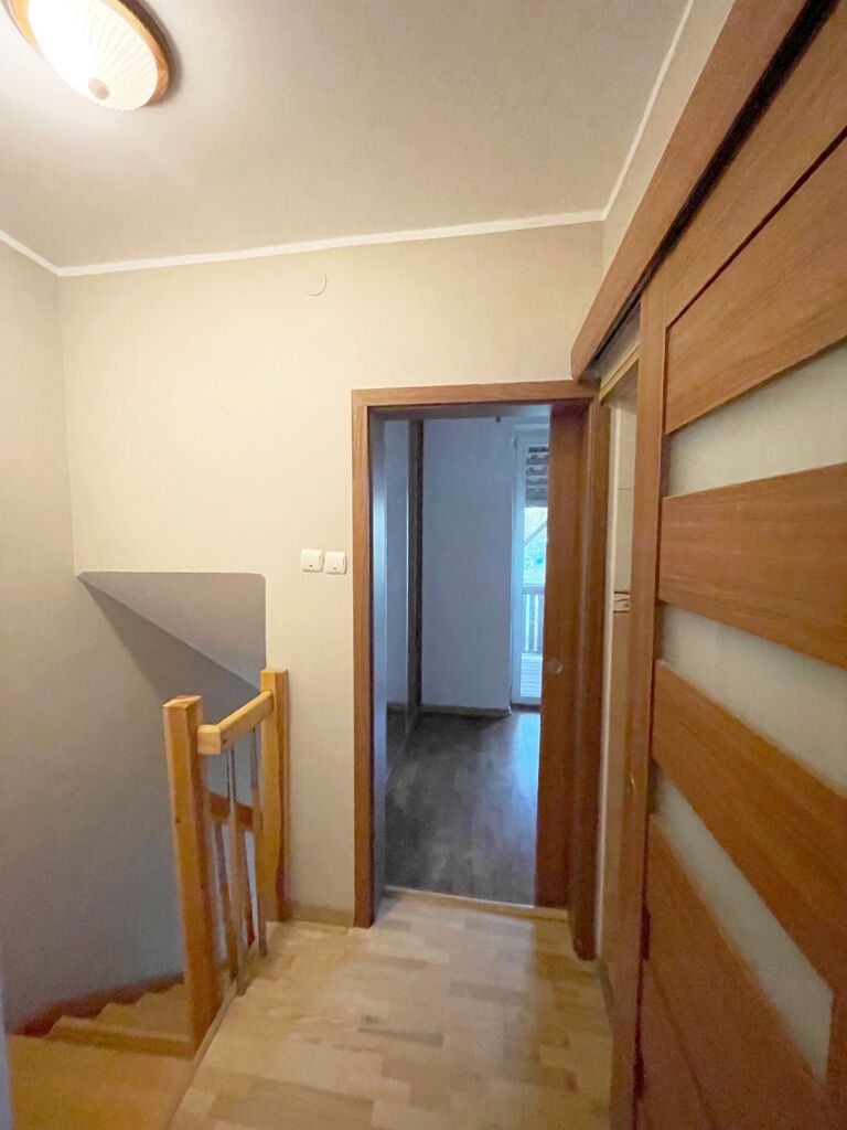 Na pierwszym piętrze do którego prowadzą drewniane schody znajduje się korytarz , 3 nieduże pokoje ( pierwotnie były 2 pokoje, można wrócić do stanu pierwotnego), łazienka z prysznicem. Z jednego pokoju wyjście na dużą werandę. Ściany w mieszkaniu gładzone i malowane, okna PCV, na podłogach panele, instalacji elektryczna miedziana.
