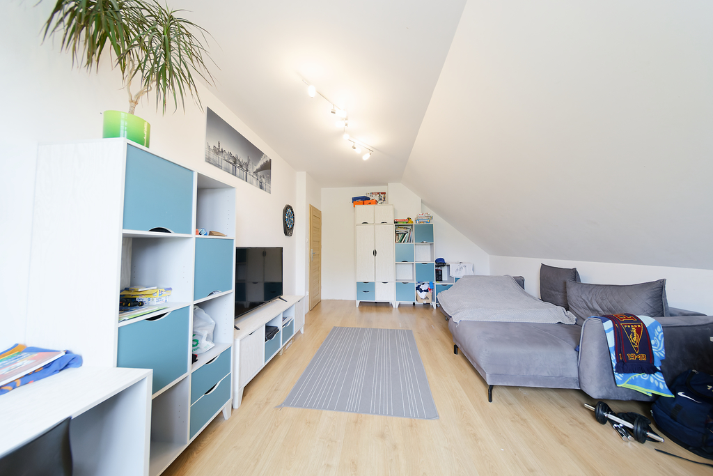 Dodatkowo, na poddaszu znajduje się strych o powierzchni 45 m², który może służyć jako dodatkowa przestrzeń magazynowa lub być zaadoptowany zgodnie z potrzebami.