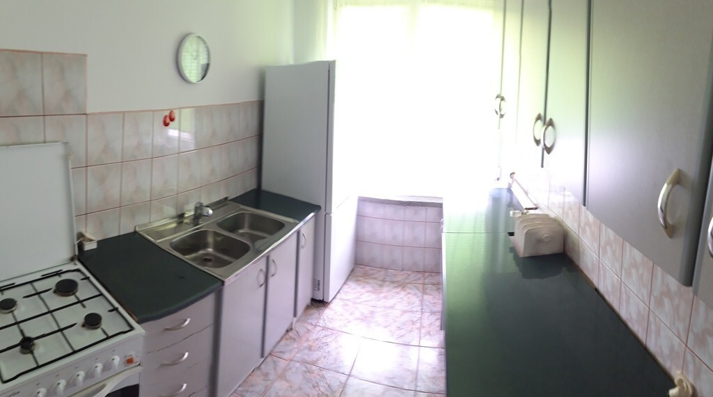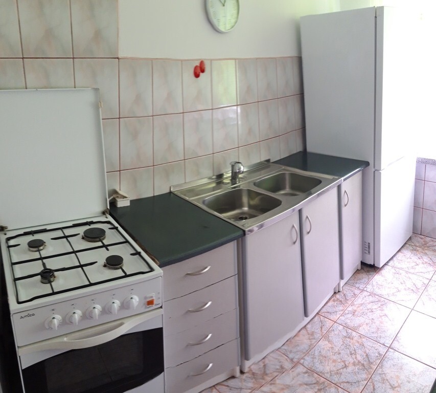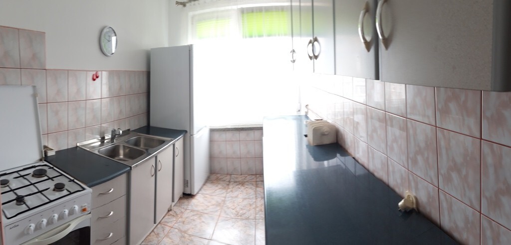 Kuchnia wyposażona jest we wszystkie niezbędne sprzęty i urządzenia czyli szafki kuchenne , kuchenkę gazową z piekarnikiem, zlewozmywak , lodówkę .