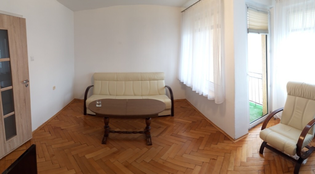 Salon z zestawem wypoczynkowym , stolikiem tv , telewizorem i meblościanką. Na podłodze drewniany parkiet. Z salonu wyjście na balkon typu logia od strony ulicy.