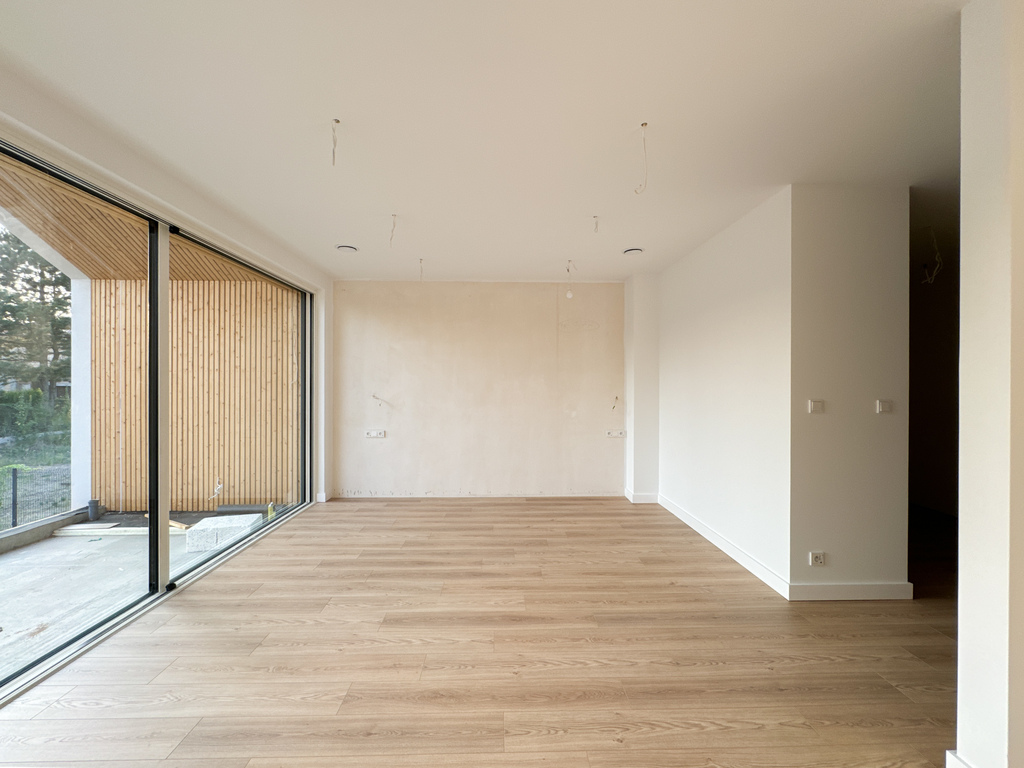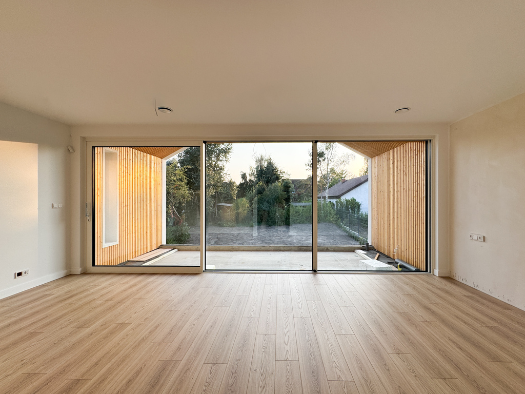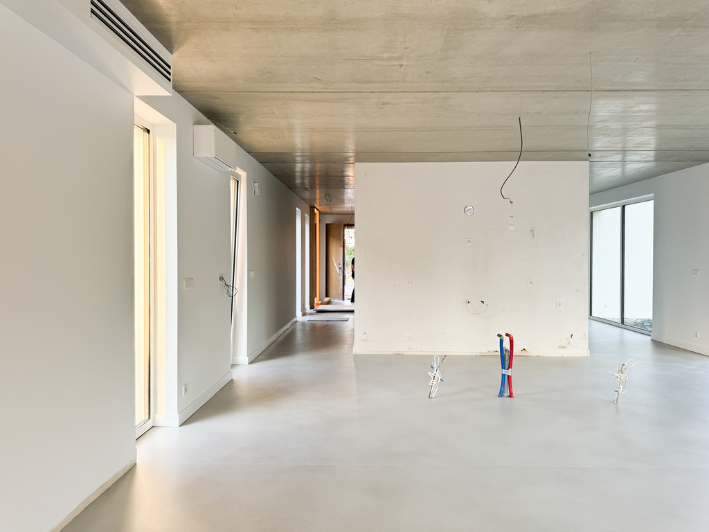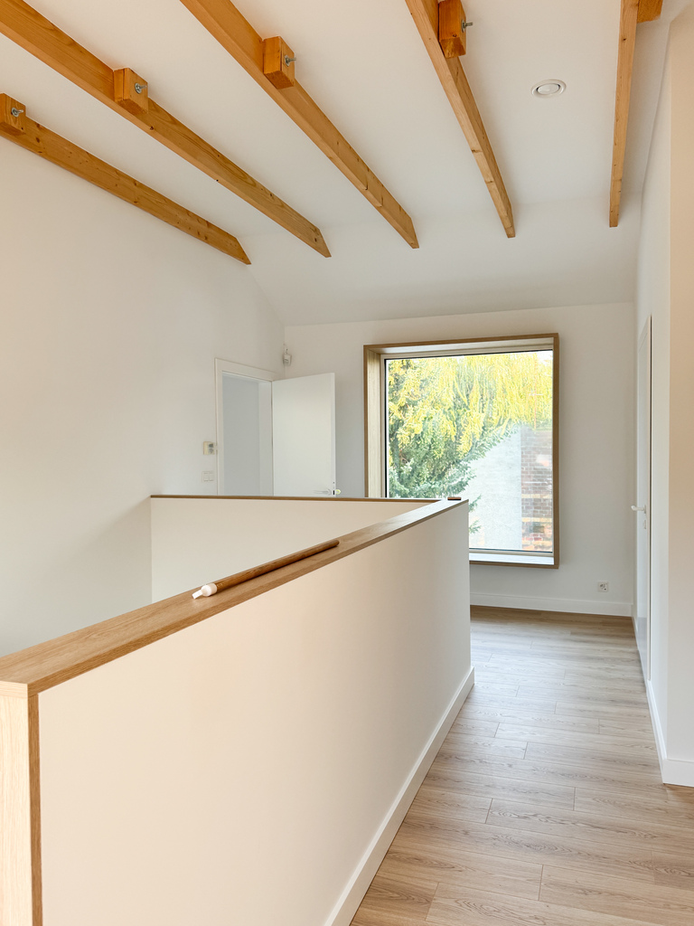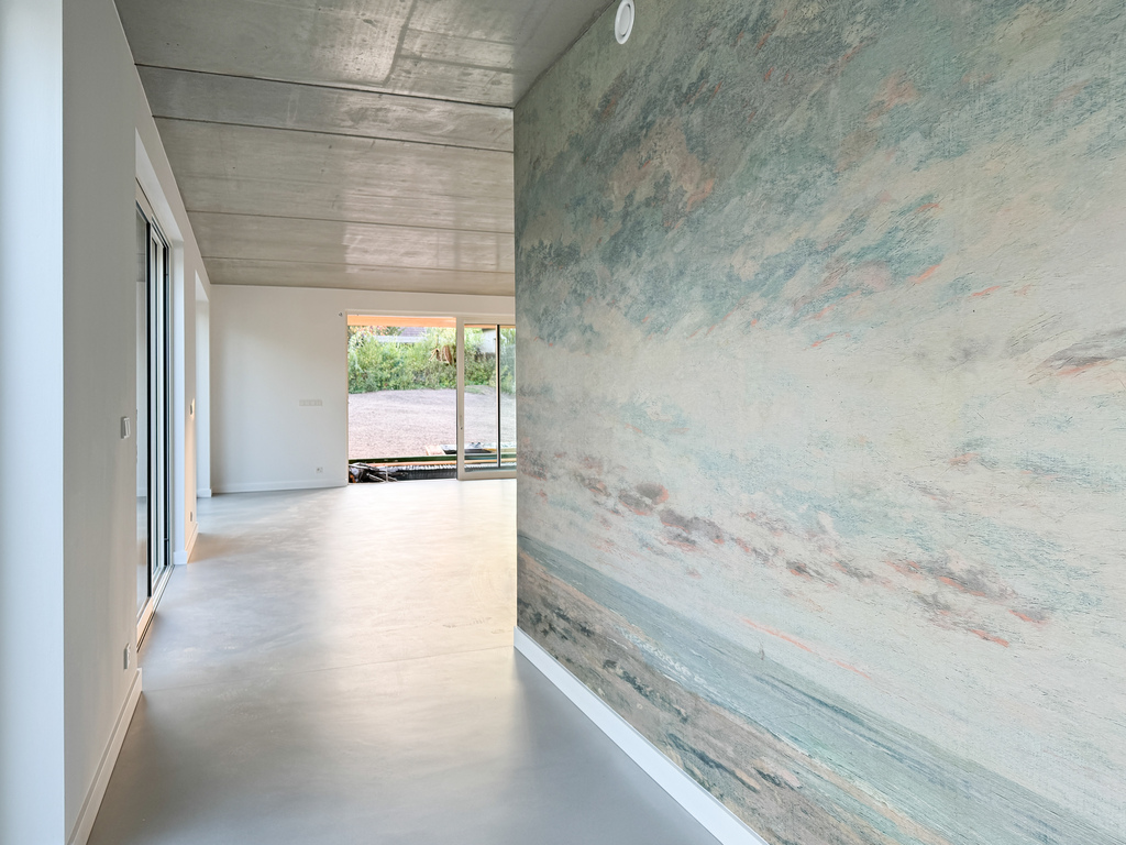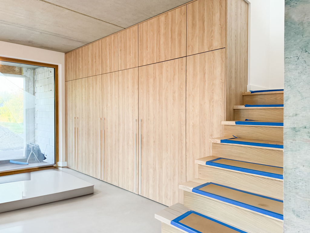 Wejście do domu od wschodniej strony zaprasza pięknymi drzwiami, na podłodze parteru zastosowano nadający nowoczesnego stylu mikrocement. Zabudowa szaf ukrywa w sobie przejście do 2-stanowiskowego garażu. Zamontowane zostało duże lustro wykonane na zamówienie.