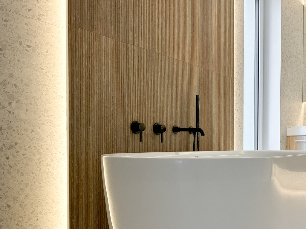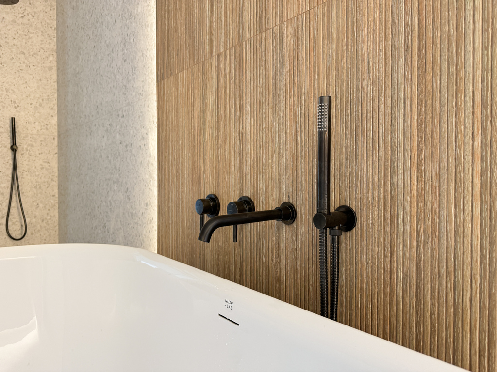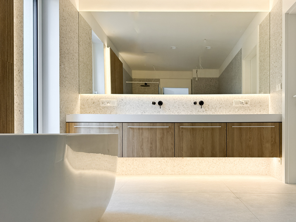Łazienka z wolnostojącą wanną, prysznicem, podwójną umywalką oraz miejscem na toaletkę.