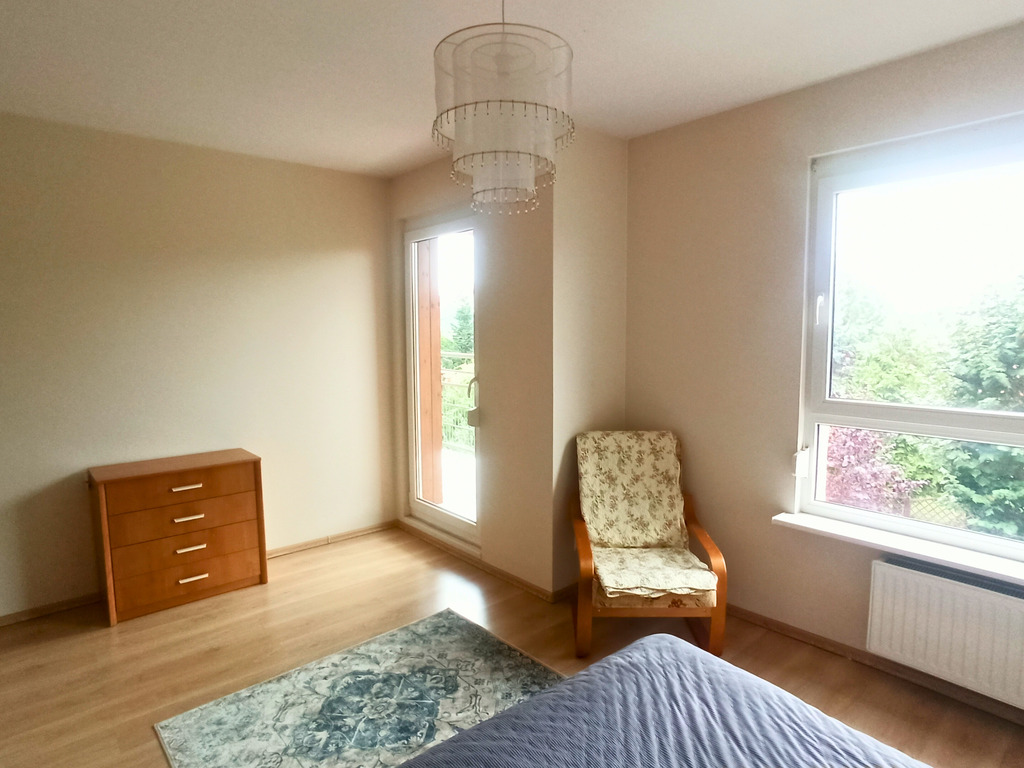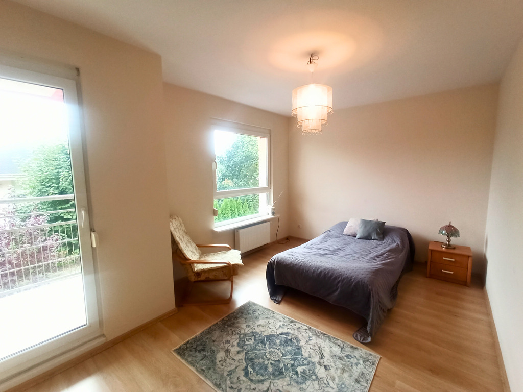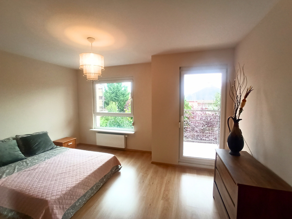 - Dwie przestronne sypialnie (16 m² i 15 m²) – każda z balkonem, oferujące piękny widok na zieleń
