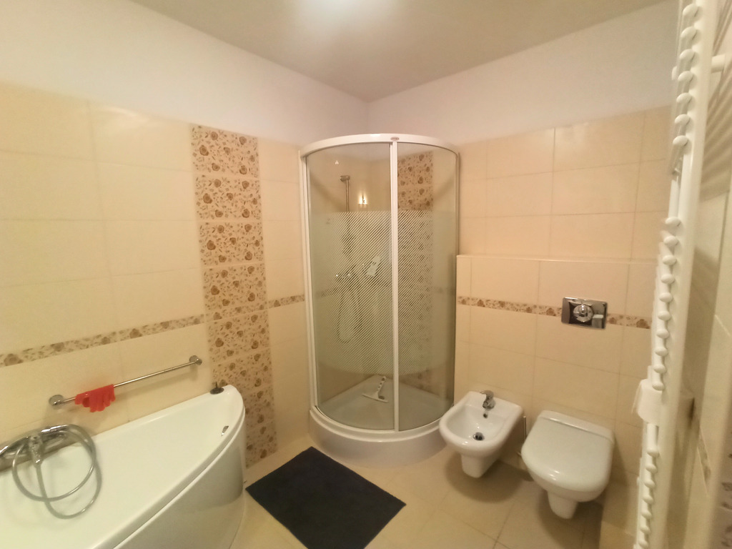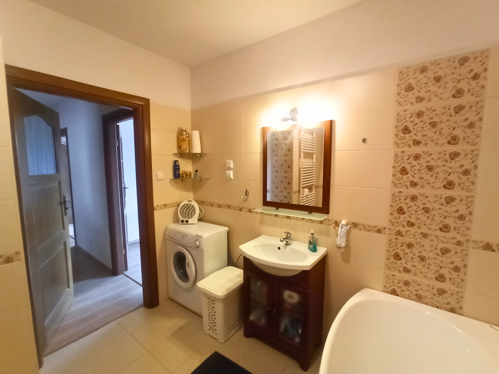 - Pokój kąpielowy (7 m²) – elegancko wykończony, wyposażony w dużą wannę, kabinę prysznicową, bidet oraz WC