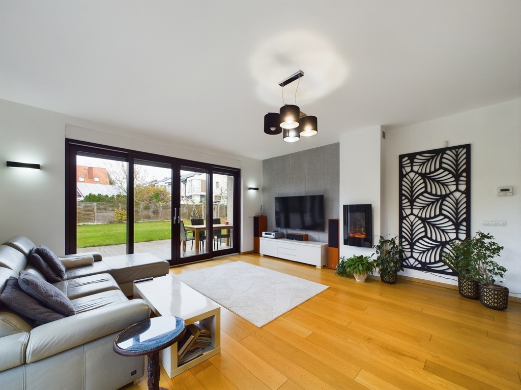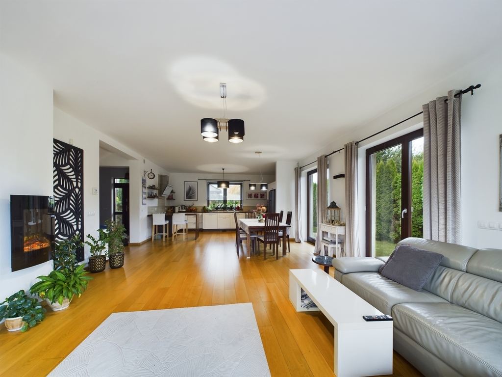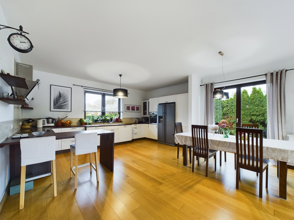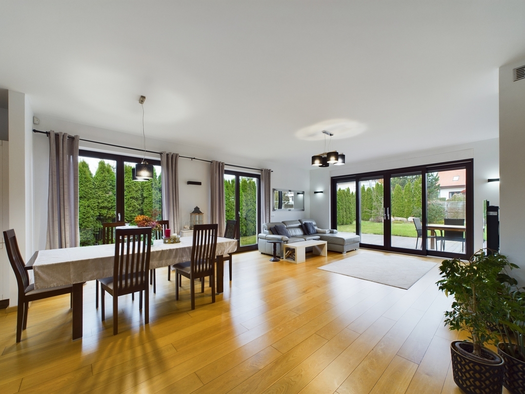 - przestronny salon z kuchnią i jadalnią oraz wyjściem na ogród i taras -wykończony z wysokiej jakości materiałów