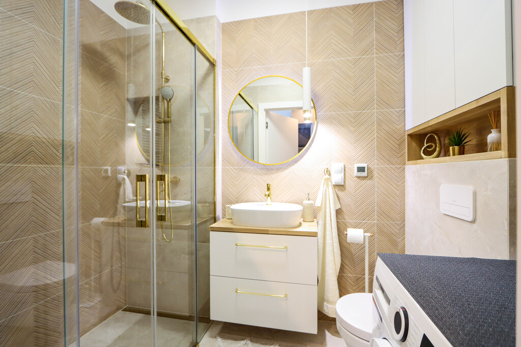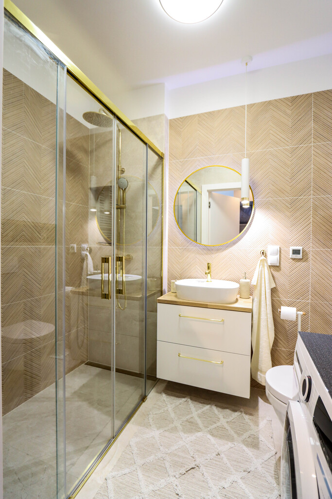 - Łazienka z przeszkloną kabiną prysznicową.