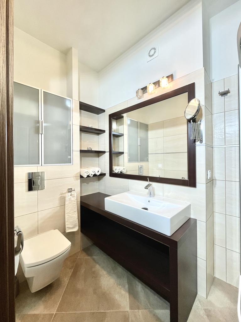 - *Łazienką z toaletą*, wyposażoną w niezbędne udogodnienia. Osiedle zapewnia mieszkańcom bezpieczeństwo oraz komfort, a nowoczesna winda ułatwia dostęp do mieszkania.