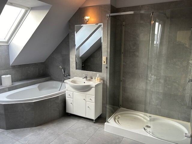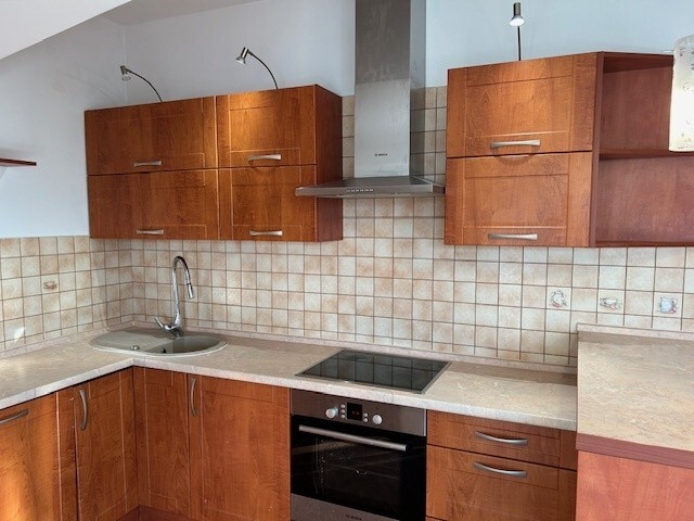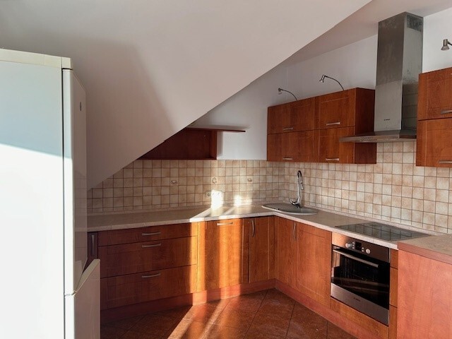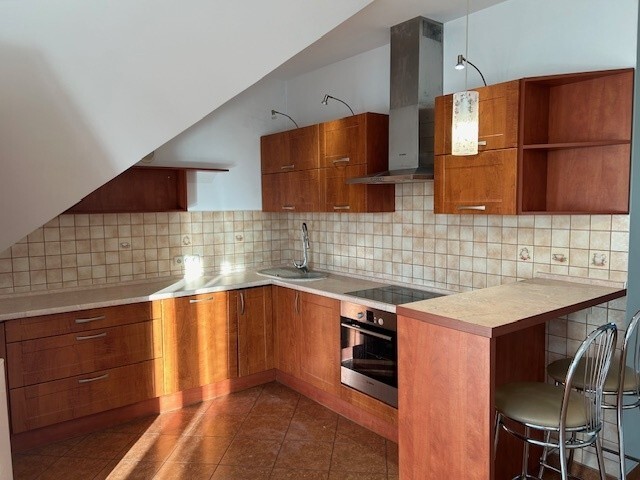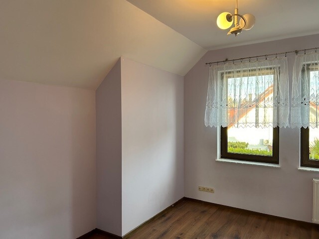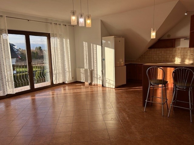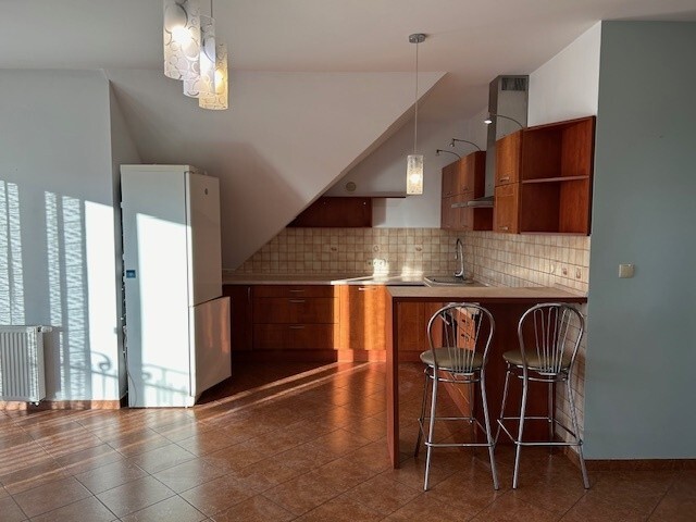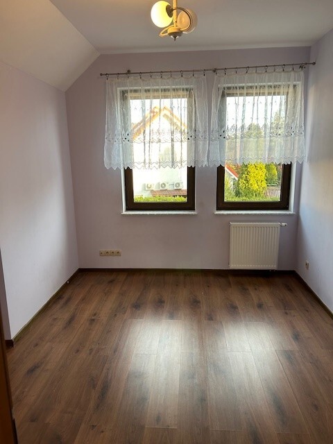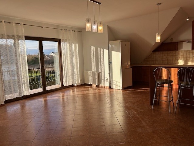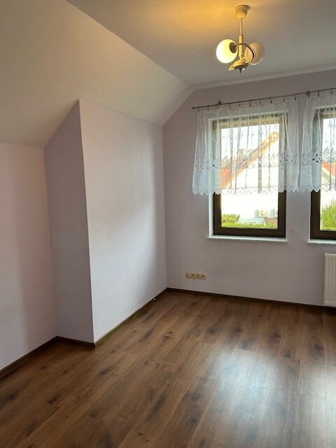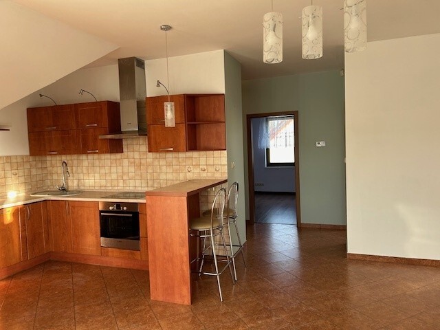 Apartment 100 m2, on the first floor of a four-family new semi-detached house located in an attractive location. Each semi-detached house has two separate apartments with separate entrances to the house and apartments. Living room with an area of 25.4 m2 connected to a kitchenette 11 m2, a total of 36.4 m2, plus three bedrooms: 17.22 m2, 13.68 m2, 11.43 m2. From the living room exit to a very large balcony. Bathroom with a window connected to a toilet with an area of 12.64 m2 with a bathtub and shower cubicle and a washing machine. Kitchen furnished and equipped with household appliances (stove with oven, dishwasher, sink, fridge with freezer. Very high standard of finish. Rent PLN 3,800 additional charges: electricity, gas (gas heating), water, internet total about PLN 800/month. Quiet, quiet location, newly built apartment. 2 above-ground parking spaces on the property behind a barrier. Good access to the center both by car and public transport.