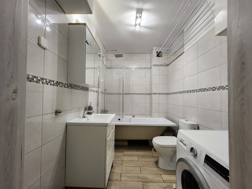 Kuchnia umeblowana. Łazienka z WC wyposażona w wannę oraz umywalkę.