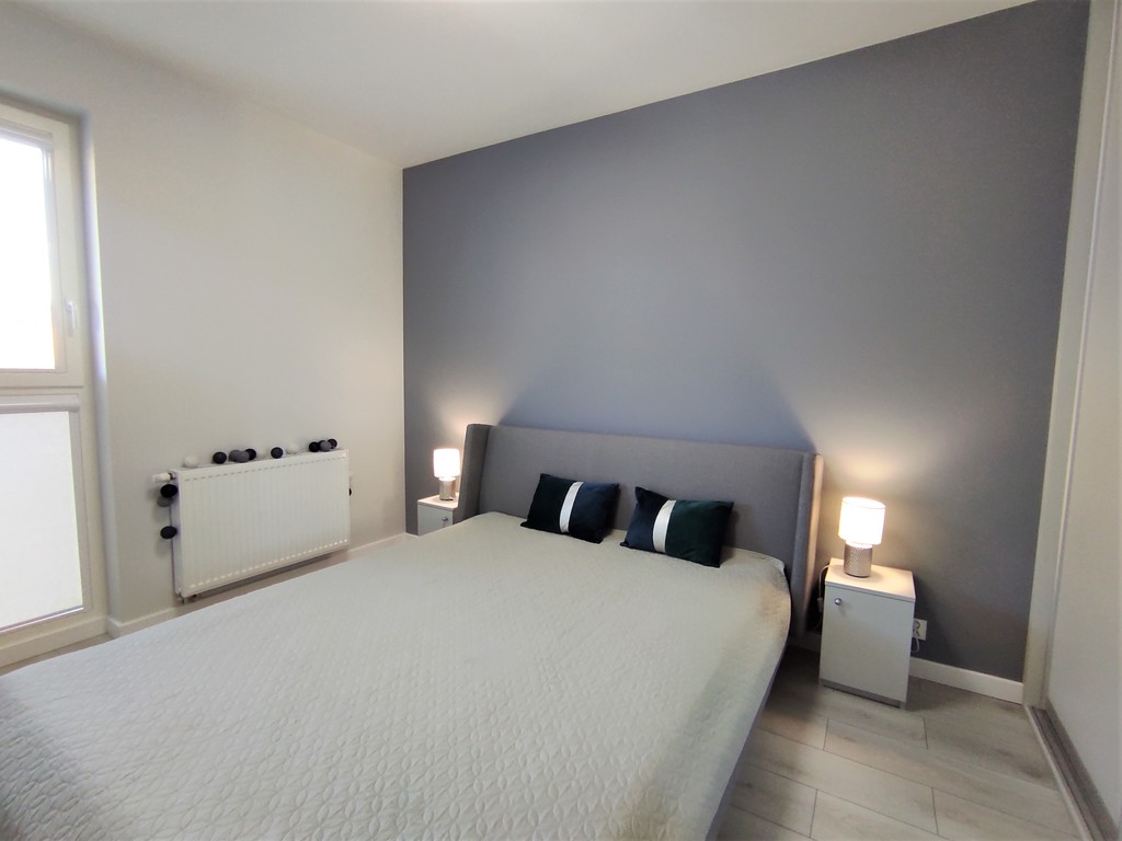 - Sypialnia o powierzchni 12 m² z dużym łóżkiem dwuosobowym oraz pojemną szafą ubraniową.