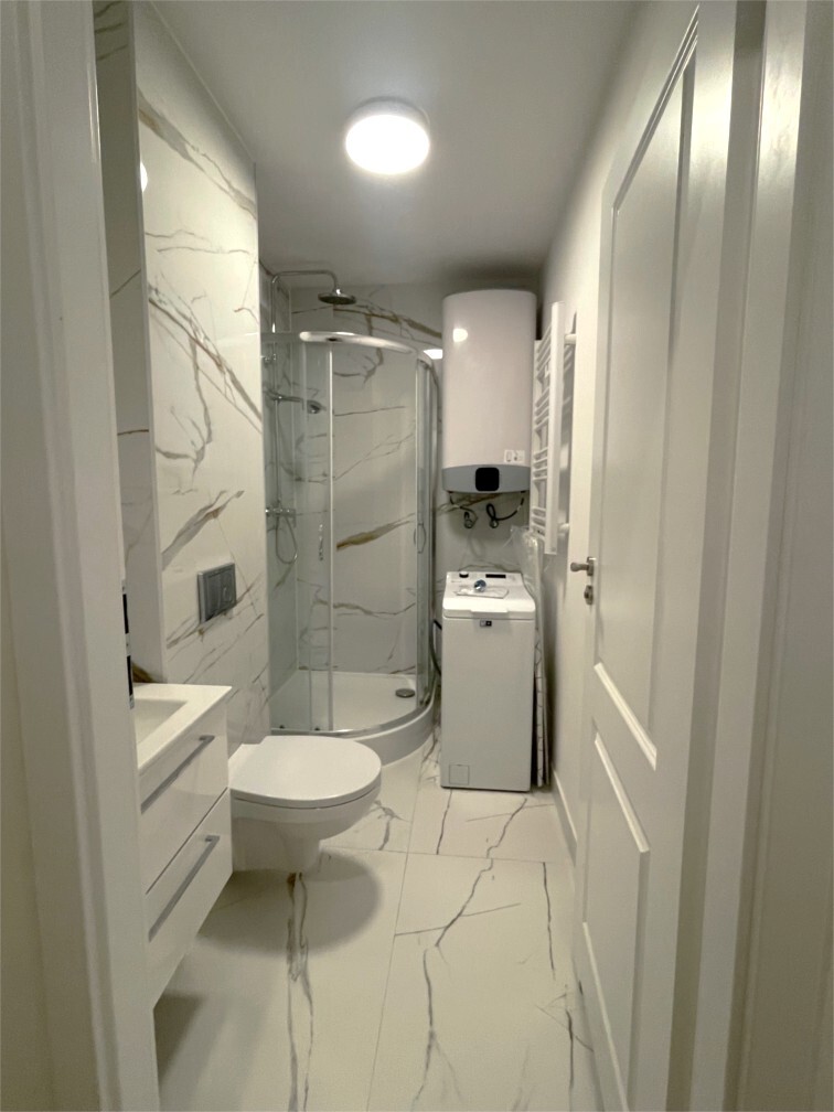 Kawalerka znajduje się na II piętrze w kamienicy. Okna skierowane są na ulicę. Jest wyposażona w aneks kuchenny (lodówka, mikrofalówka, płyta elektryczna, okap, niezbędne naczynia ), stół z czterema krzesłami, stolik kawowy, kanapa rozkładana, telewizor, szafka pod tv. Łazienka - pralka, kabina prysznicowa. Pokój ogrzewany jest panelami grzewczymi na prąd, łazienka kaloryfer drabinkowy.