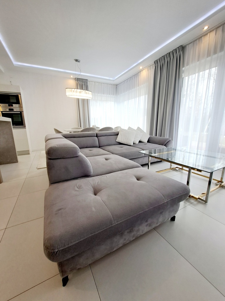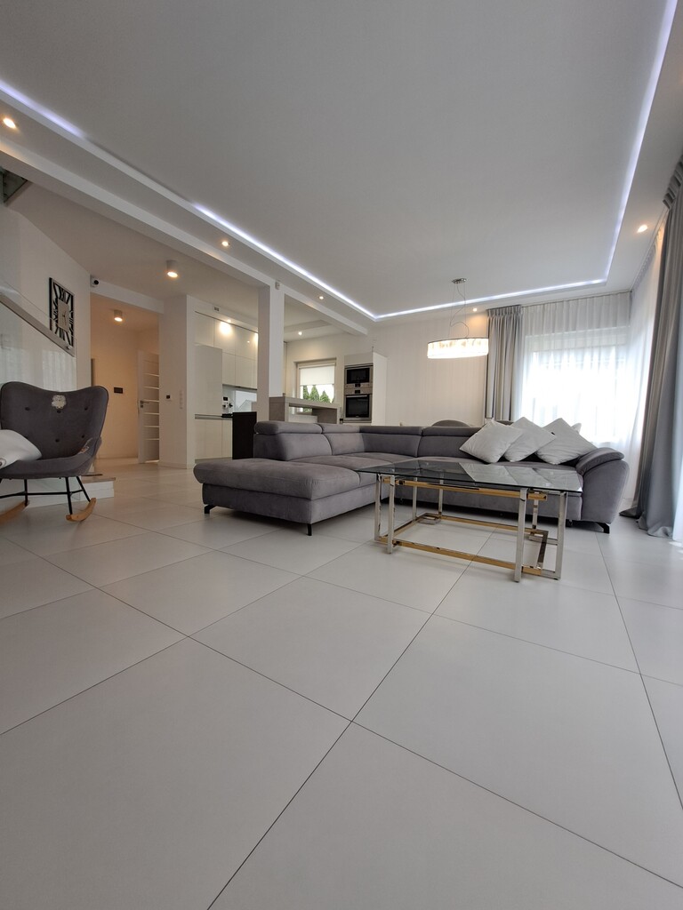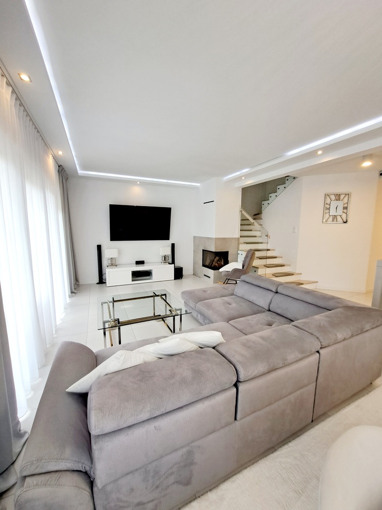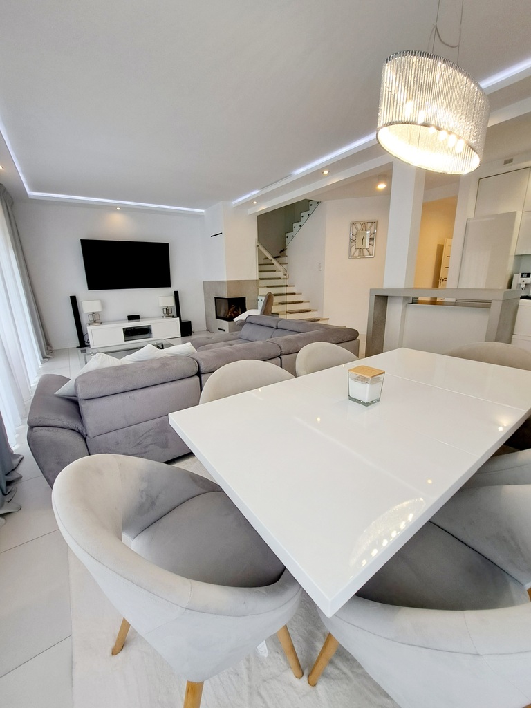 * salon z jadalnią i kominkiem ma bezpośrednie wyjście na duży ogród z tarasem .Nastrój i wygodę tworzą meble: nowoczesna sofa, fotel bujany , lampy i pozostałe oświetlenie ledowe , piękne zasłony , a wszystko utrzymane w tonacji szarości i bieli