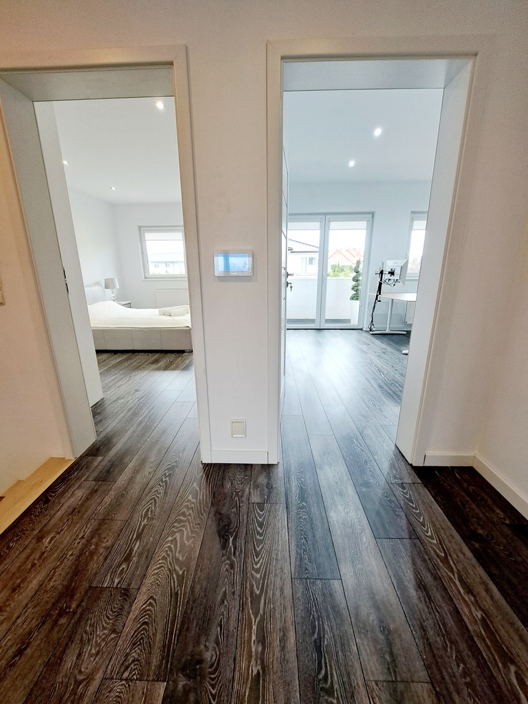 * 4 pokoje : obecnie 2 sypialnie i 2 gabinety rozmieszczone po obu stronach korytarza