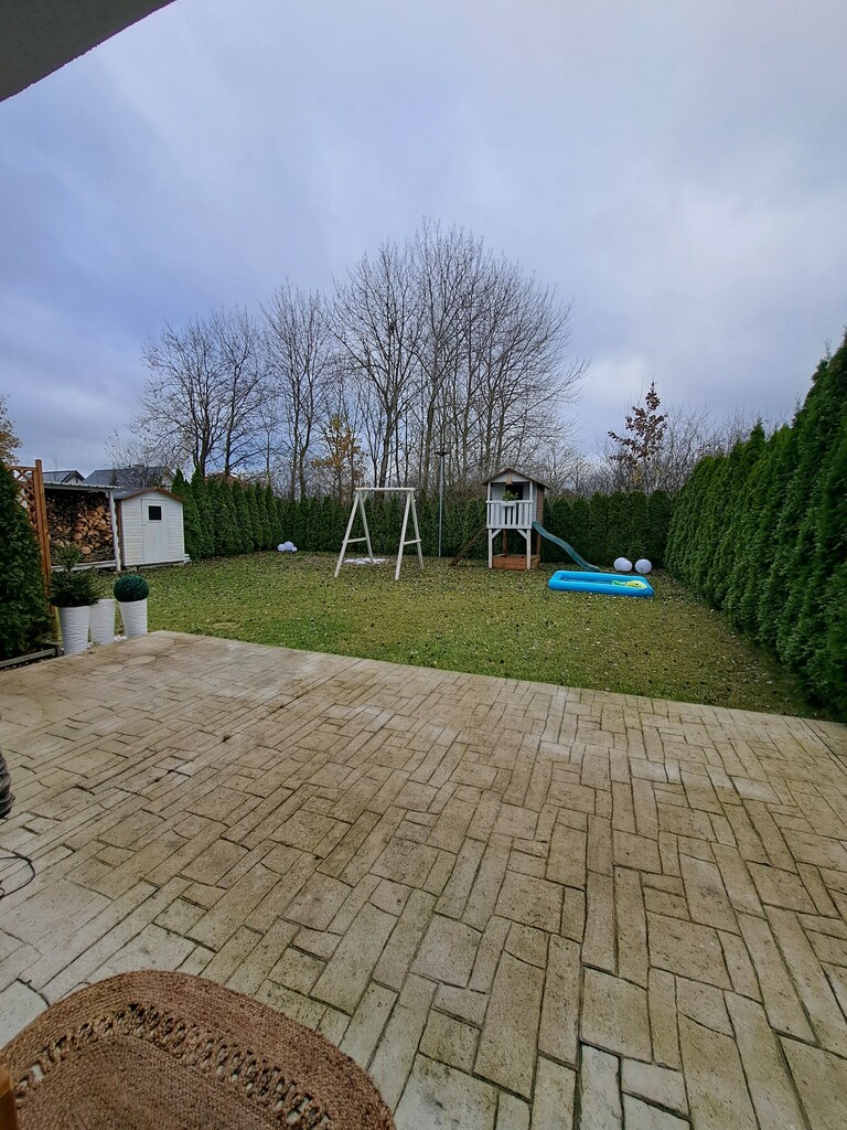 Duży ogród otoczony jest zielenią , która zapewnia intymność odpoczynku i zabawy . Na tarasie dodatkowo są meble ogrodowe wysokiej jakości .