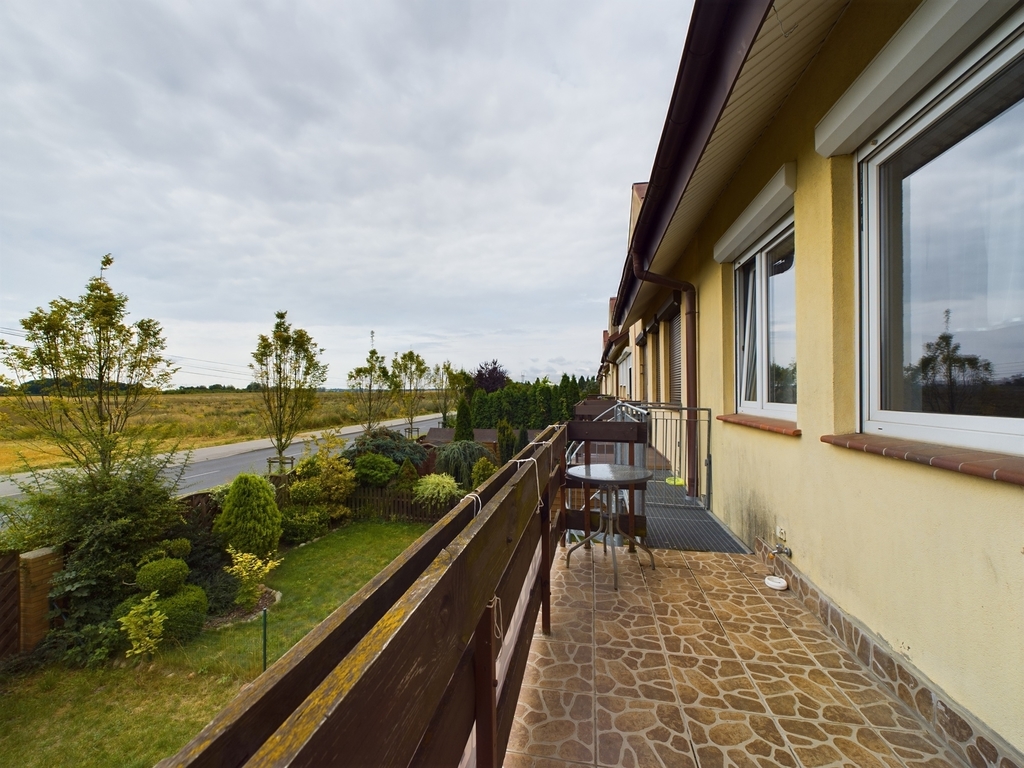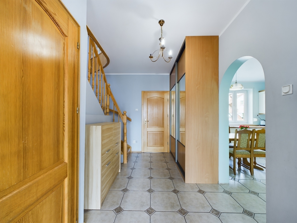 Dom wykończony z wysokiej jakości materiałów, schody i drzwi drewniane, okna PCV oraz drewniane dachowe.
