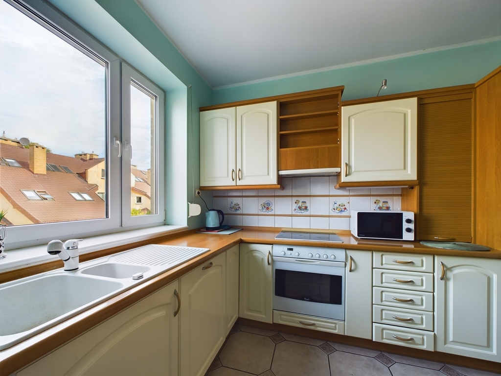 - na pierwszym poziomie: przedpokój z zabudową szaf, pokój, toaleta, bardzo ustawna i przestronna kuchnia wraz zabudową mebli i sprzętem AGD oraz jasny duży salon z wyjściem na balkon, z którego jest zejście po schodkach na własny ogródek o powierzchni ok 35 m2