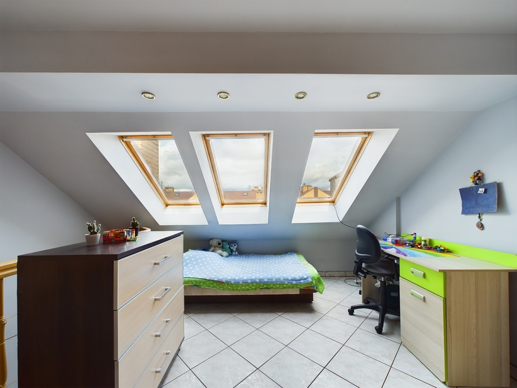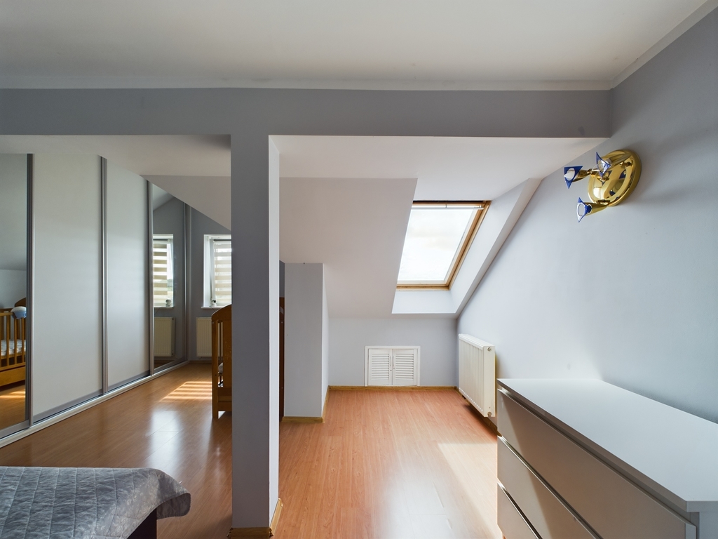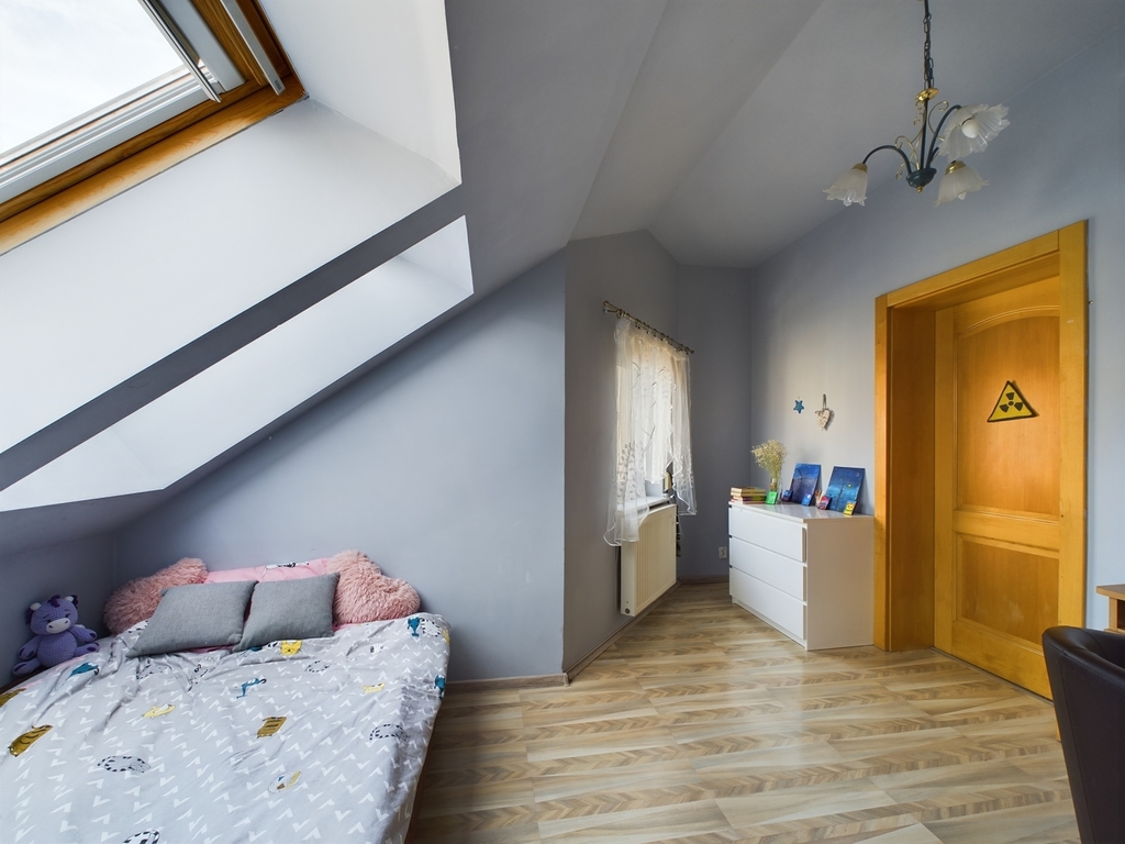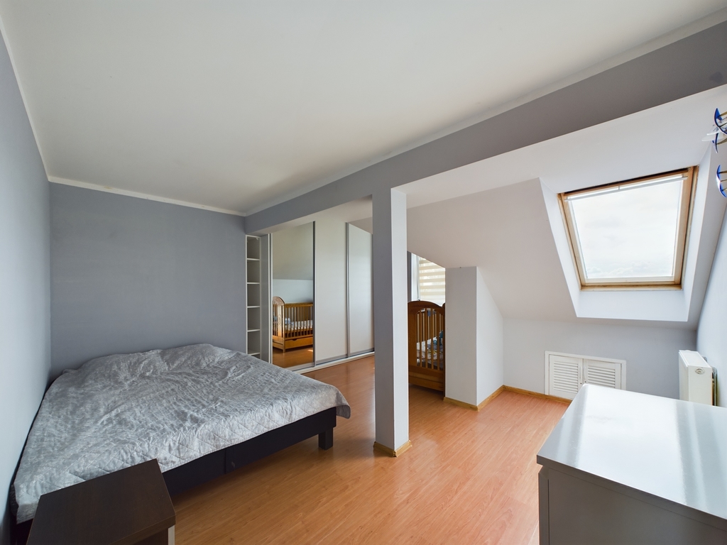 - na drugim poziomie : otwarta przestrzeń świetnie nadająca się na biuro, pomieszczenie gospodarcze -pralnia, duża łazienka z wanną, prysznicem i toaletą oraz sypialnia z dużą szafą w zabudowie, a także strych, który może służyć do przechowywania rzeczy.