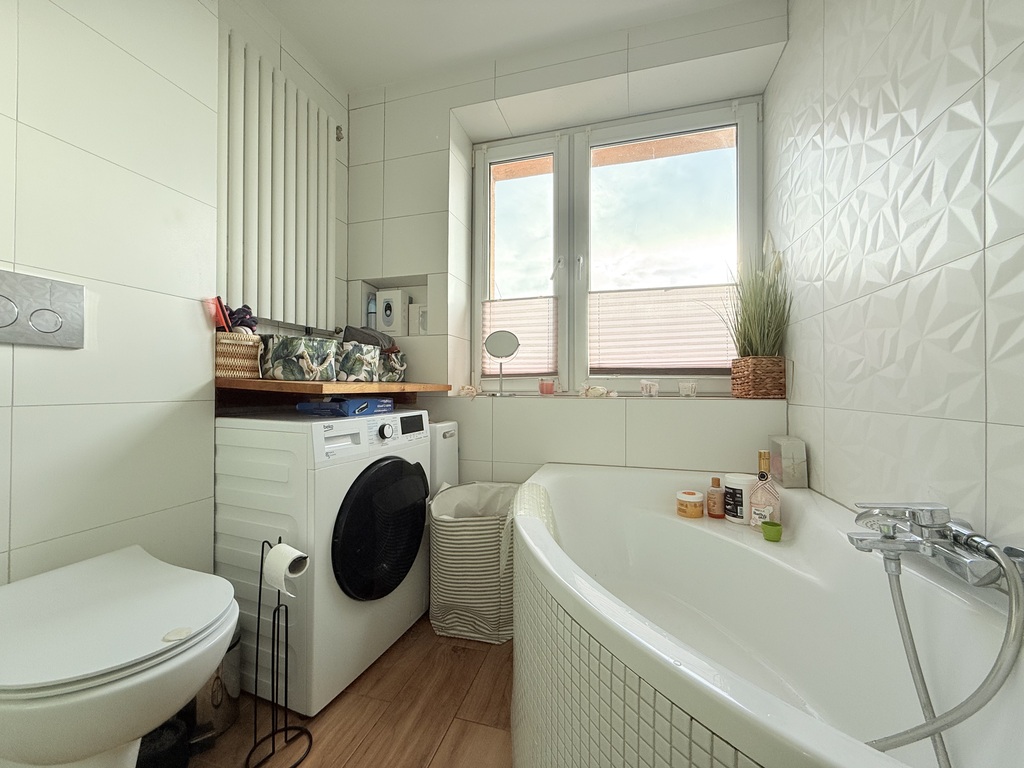 - Łazienka z dużym oknem, narożną wanną oraz prysznicem typu walk-in