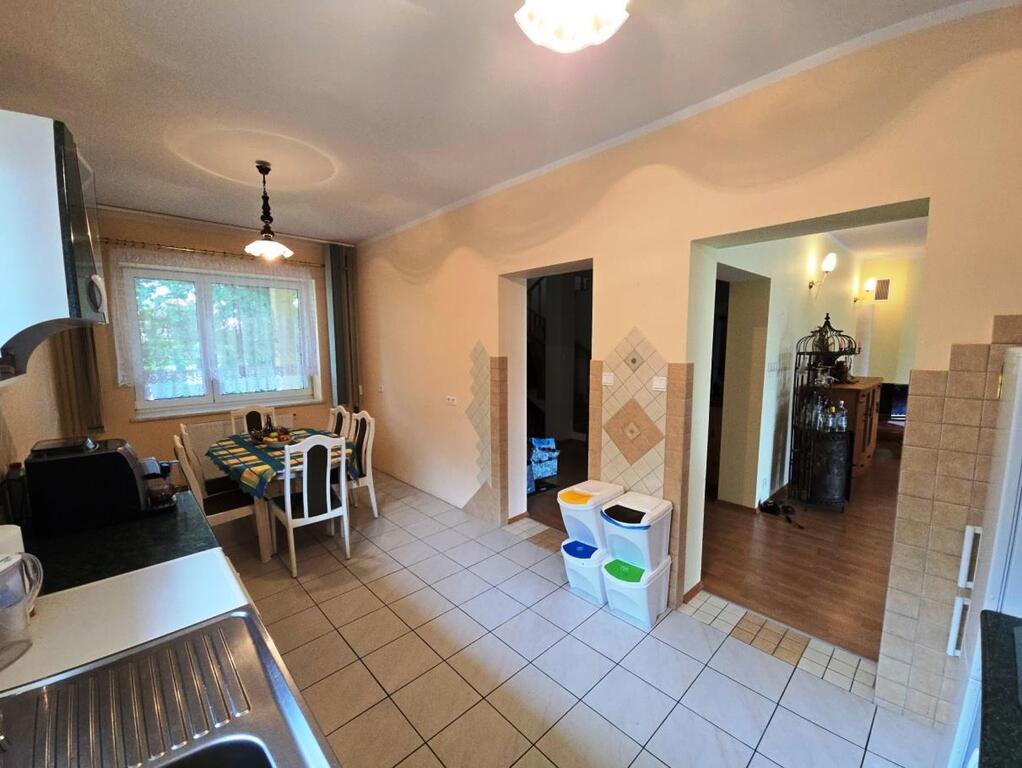 Na parterze na podłogach panele (w części dziennej, rozkładowych pokojach oraz korytarzu), w kuchni płytki. Do kuchni możliwe wejście zarówno z korytarza, jak i bezpośrednio z salonu. Kuchnia wyposażona w piekarnik z płytą elektryczną, lodówkę z zamrażarką, zmywarkę.