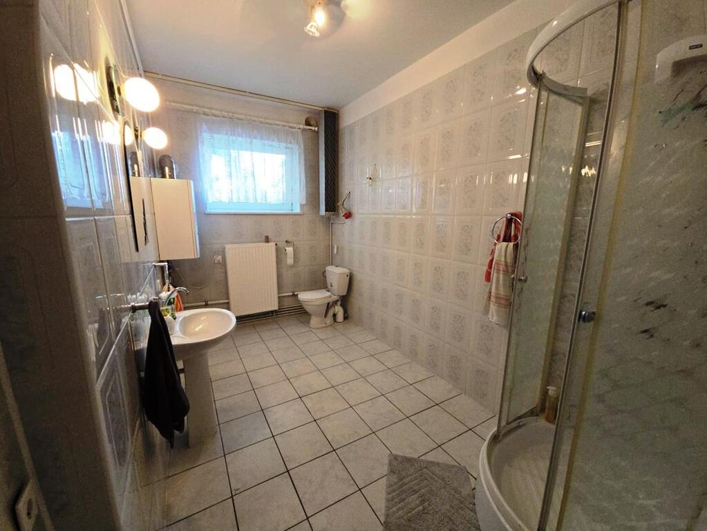 Łazienka przestronna, z kabiną prysznicową.