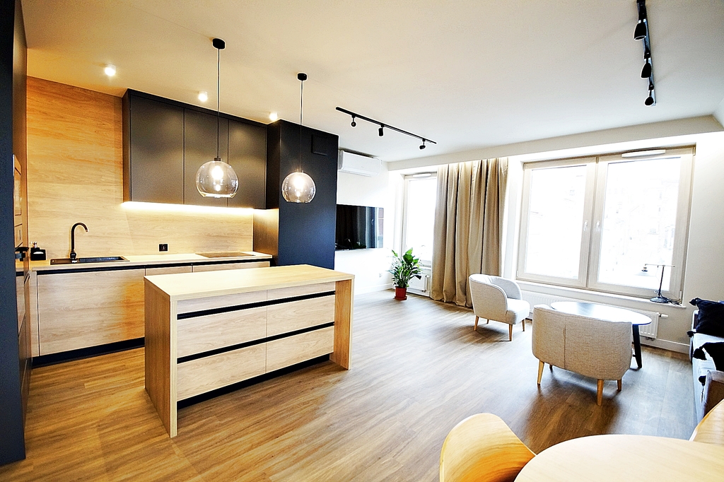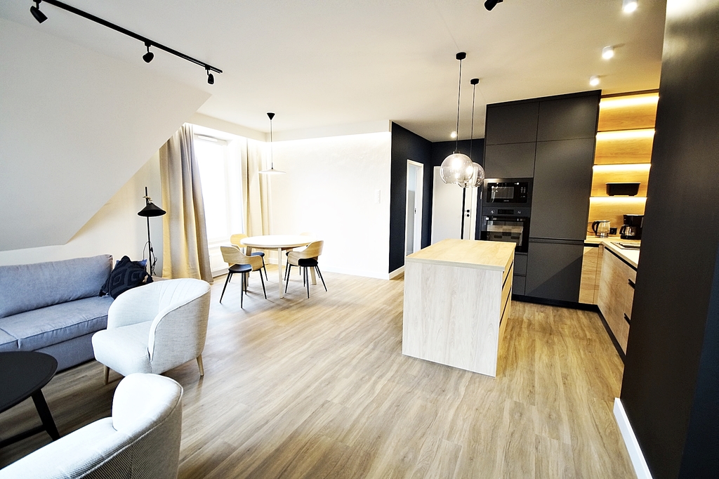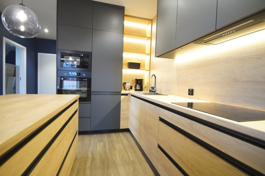 - Nowoczesna kuchnia otwarta z wyspą ok. 6 m2 na podłodze panele winylowe, w pełni wyposażona we wszystkie sprzęty AGD( zmywarka, lodówka, okap, kuchenka elektryczna, płyta grzewcza indukcyjna.