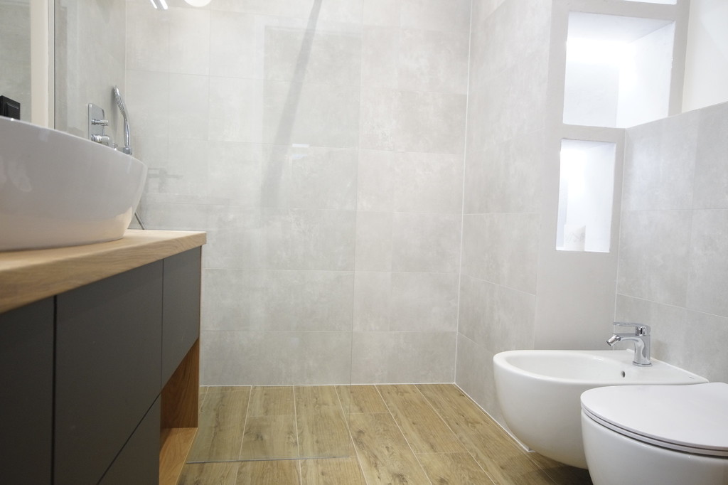 - Łazienka ok 5m2 uposażona w kabinę prysznicową, umywalkę, WC oraz bidet w glazurze i terakocie.