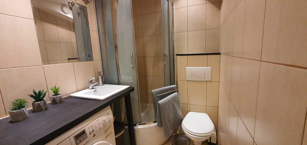 Łazienka w nowoczesnej glazurze i terakocie, z kabina prysznicową i WC, z pralką.