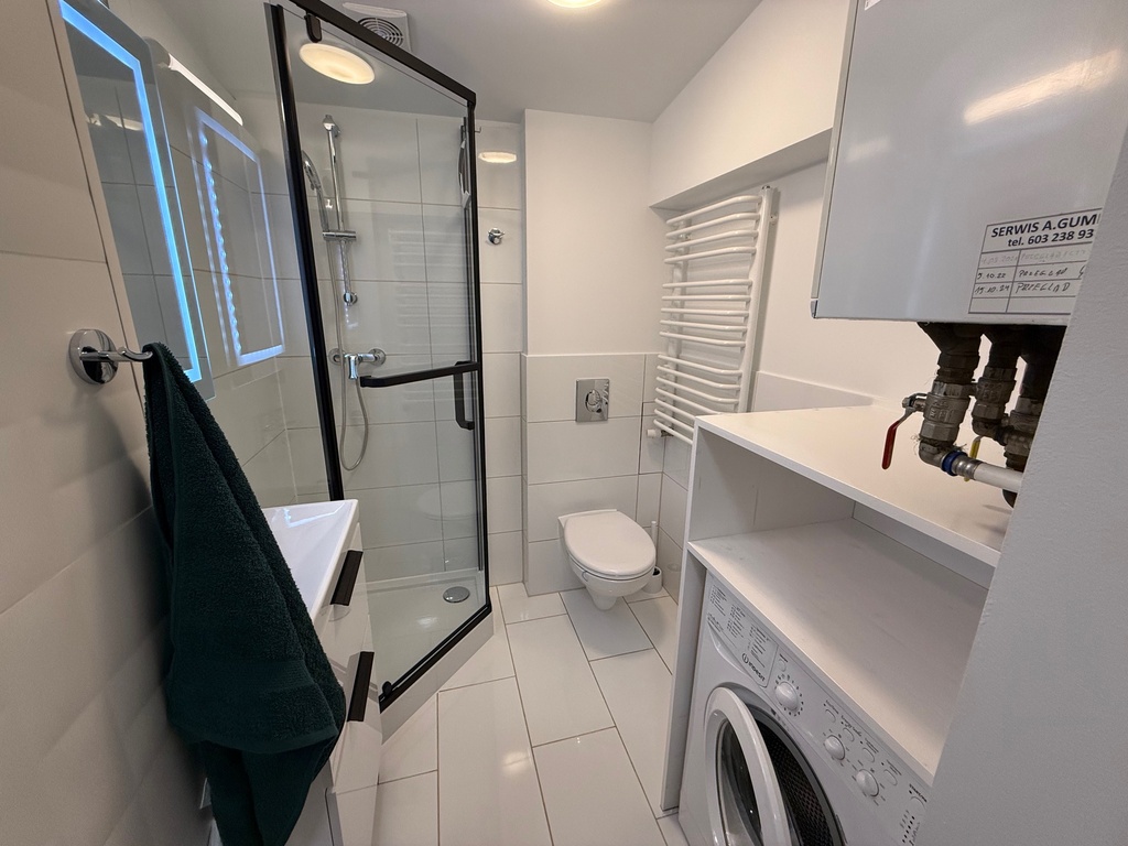 Łazienka: prysznic, wc, szafka z umywalką, pralka.
