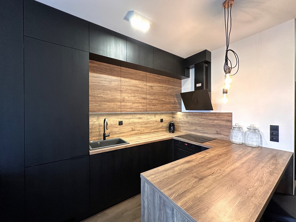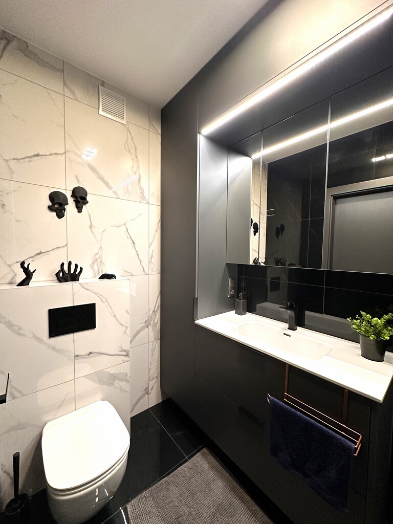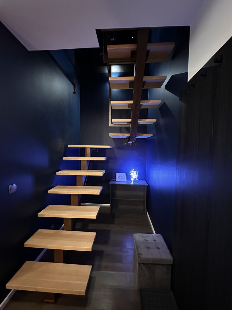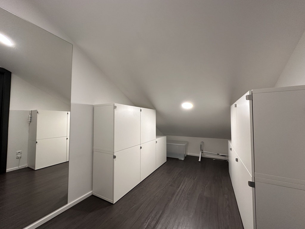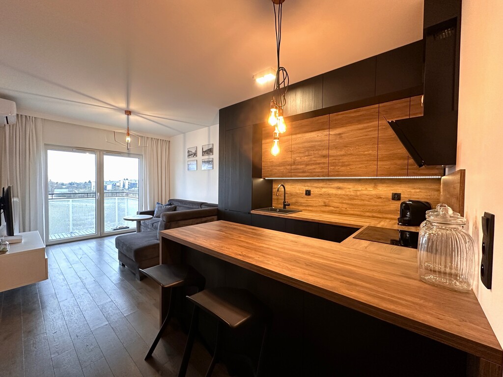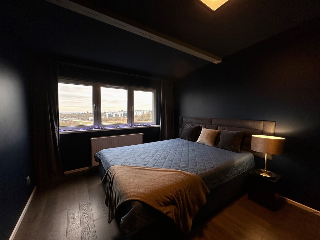 Dolna część mieszkania składa się z przytulnego salonu, z którego prowadzi bezpośrednie wyjście na balkon z widokiem na panoramę miasta, funkcjonalnego aneksu kuchennego z piękną zabudową meblową na wymiar oraz niezbędnymi sprzętami AGD (lodówka, płyta indukcyjna, piekarnik, zmywarka oraz okap), pokoju przeznaczonego na biuro, w którym znajduje się duże biurko w stałej zabudowie i dwie szafy oraz z komfortowej łazienki z WC, dużym prysznicem, umywalką i szafką gospodarczą. Na wyższym piętrze znajduje się klimatyczna sypialnia z dużym łóżkiem oraz spora garderoba, w której umieszczono m.in. pralkę i suszarkę bębnową oraz zorganizowano miejsce do przechowywania ubrań i innych akcesoriów.