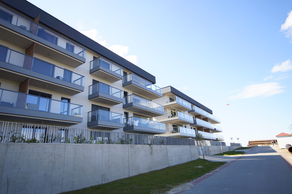 Apartament usytuowany jest w nowoczesnym, komfortowym apartamentowcu z 2019r z windą zjeżdżającą do poziomu garażu w pierwszej linii zabudowy od morza). Kompleks budynków jest dostępny jedynie dla mieszkańców, ogrodzony i stale monitorowany. Do dyspozycji mieszkańców jest plac zabaw dla dzieci, tereny zielone.