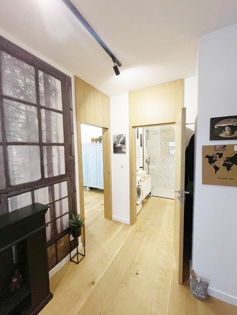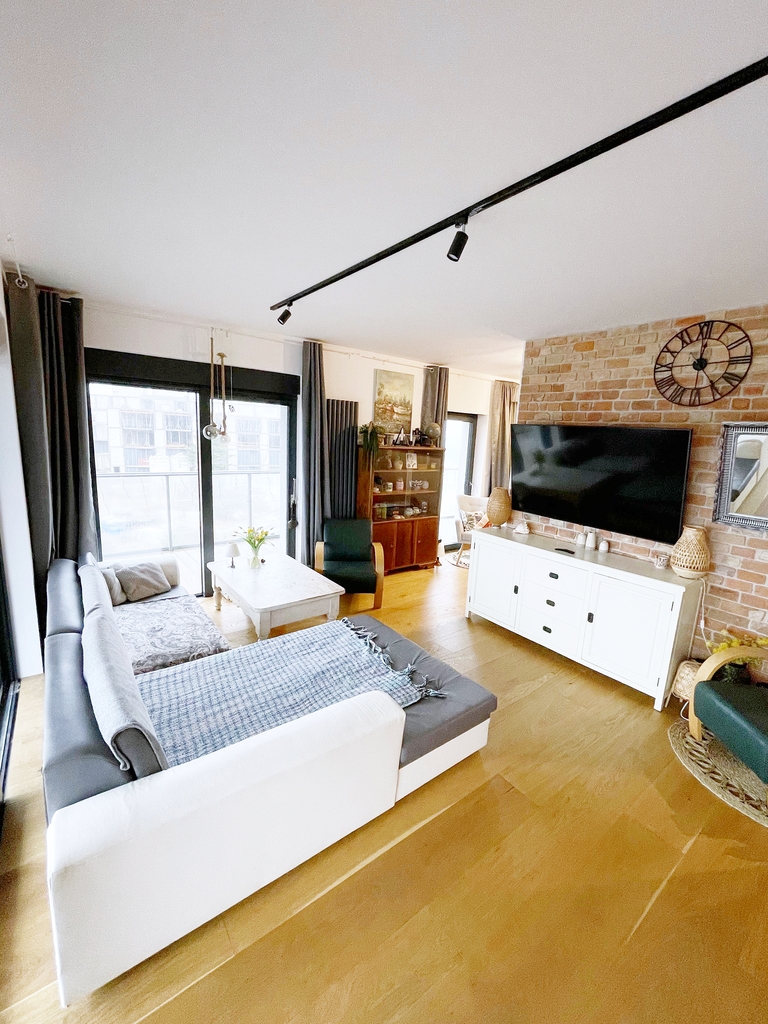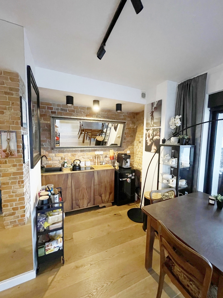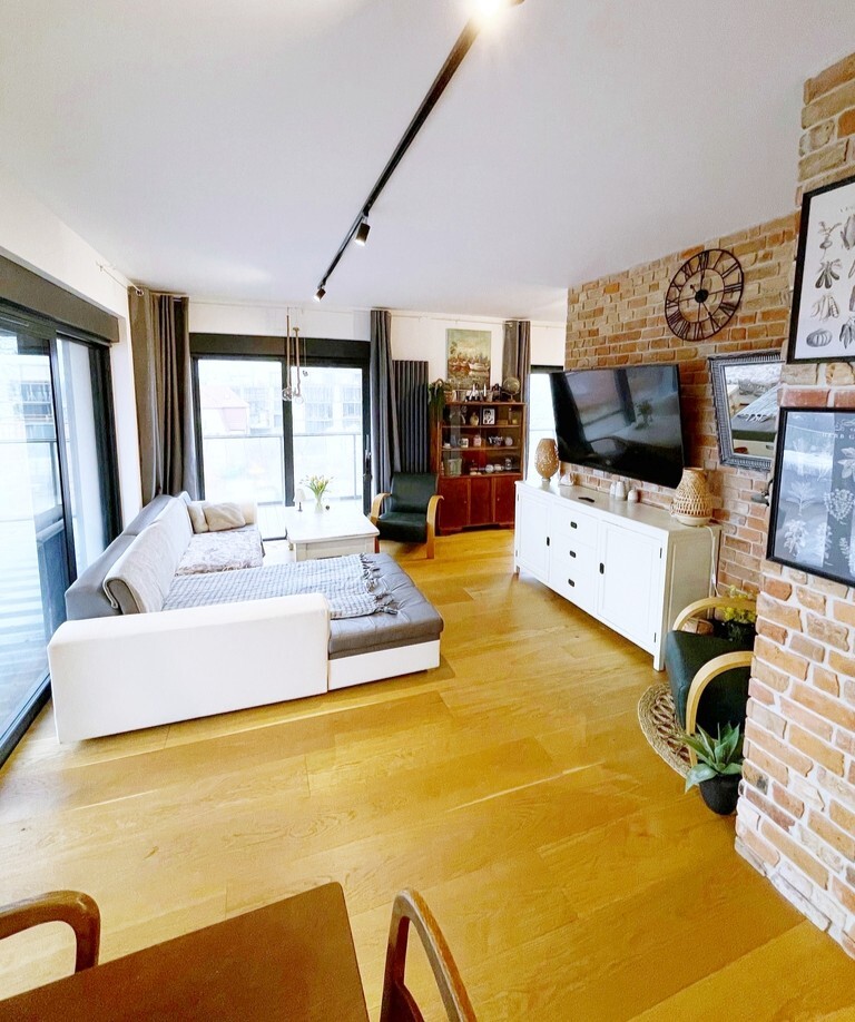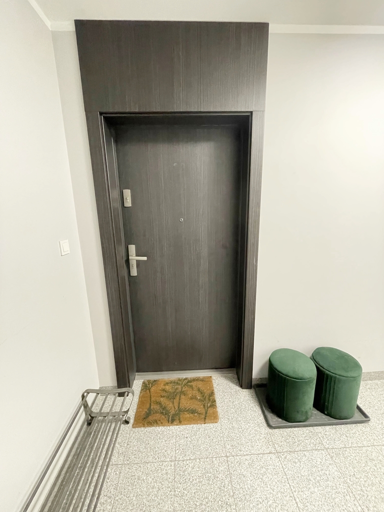 Apartament jest nowocześnie wykończony, z łazienką wyposażoną w kabinę prysznicową z odpływem liniowym wc i umywalkę oraz kompletnie wyposażonym i umeblowanym aneksem kuchennym ( meble w zabudowie, płyta kuchenna, zmywarka, lodówka) .