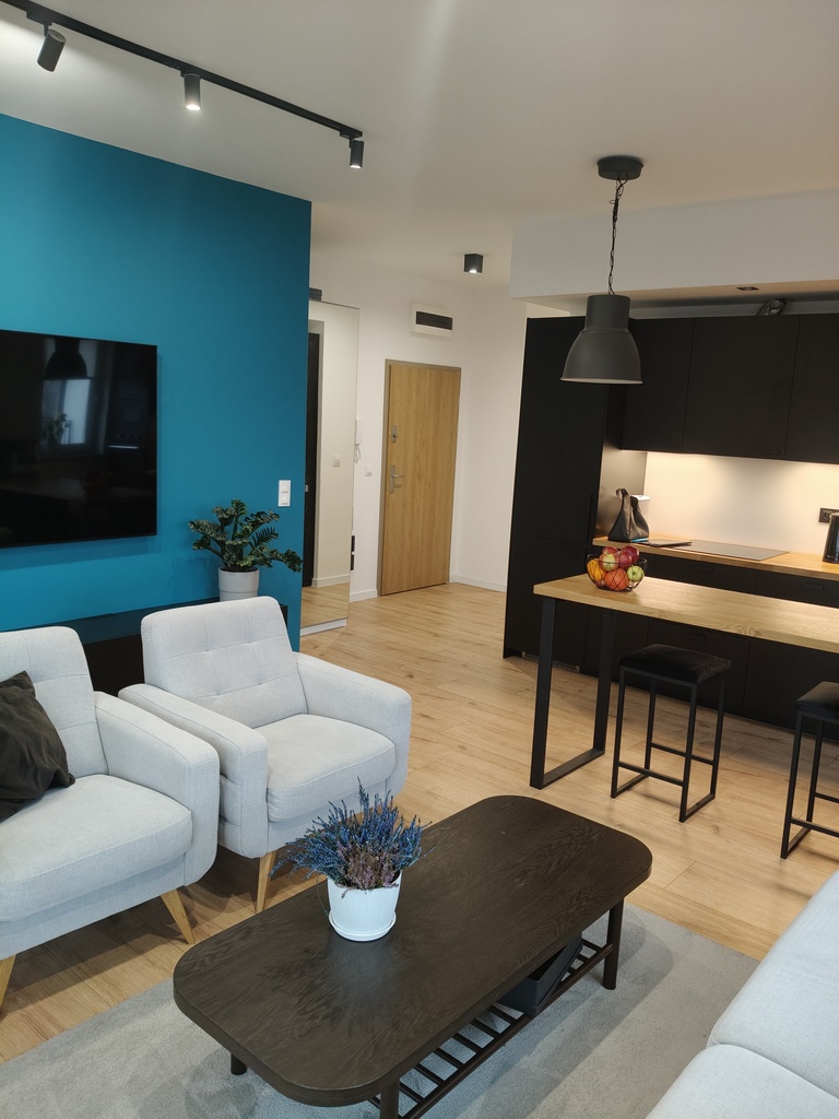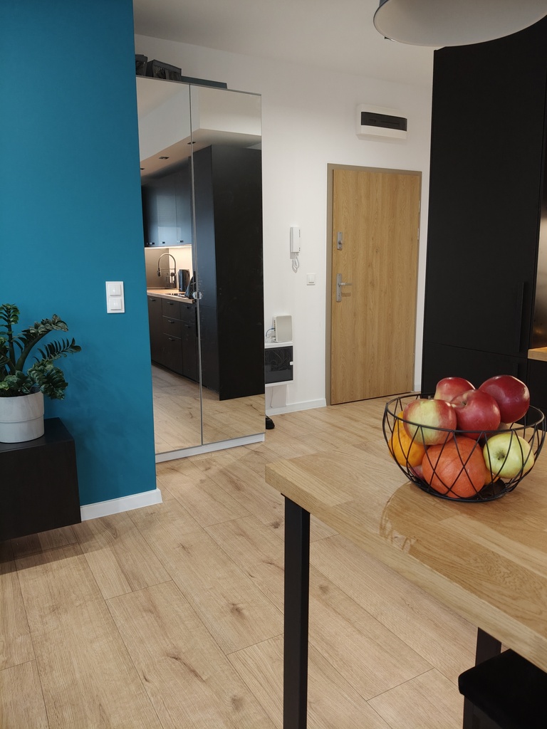 Mieszkanie składa się z przestronnego salonu z aneksem kuchennym o powierzchni 26,13 m², wyposażonym w nowoczesną zabudowę kuchenną wraz ze sprzętem AGD. Sypialnia z funkcjonalną, zabudowaną szafą na wymiar oraz dodatkowy pokój pełniący funkcję biura, zapewniają komfort i możliwość efektywnej pracy w domowych warunkach.