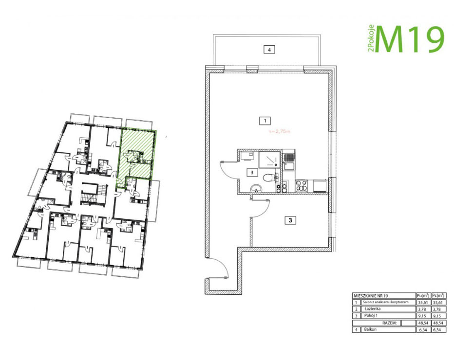 Prezentowany lokal mieszkalny ma powierzchnię 48,54 m2 i składa się z dwóch rozkładowych pokoi w tym jeden w aneksie kuchennym z wyjsciem na obszerny balkon 6,34 m2 (35,61/9,15 m2) oraz łazienki 3,78 m2. W cenie komórka lokatorska 4,16 m2.
