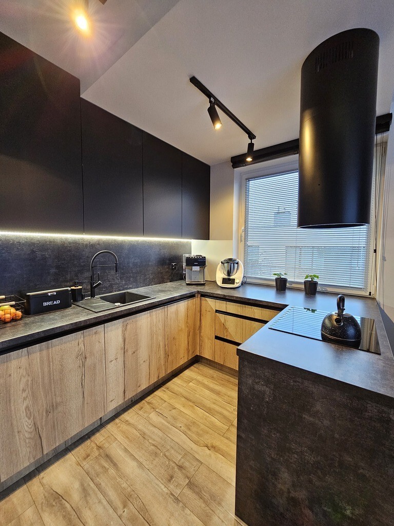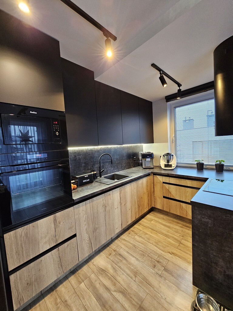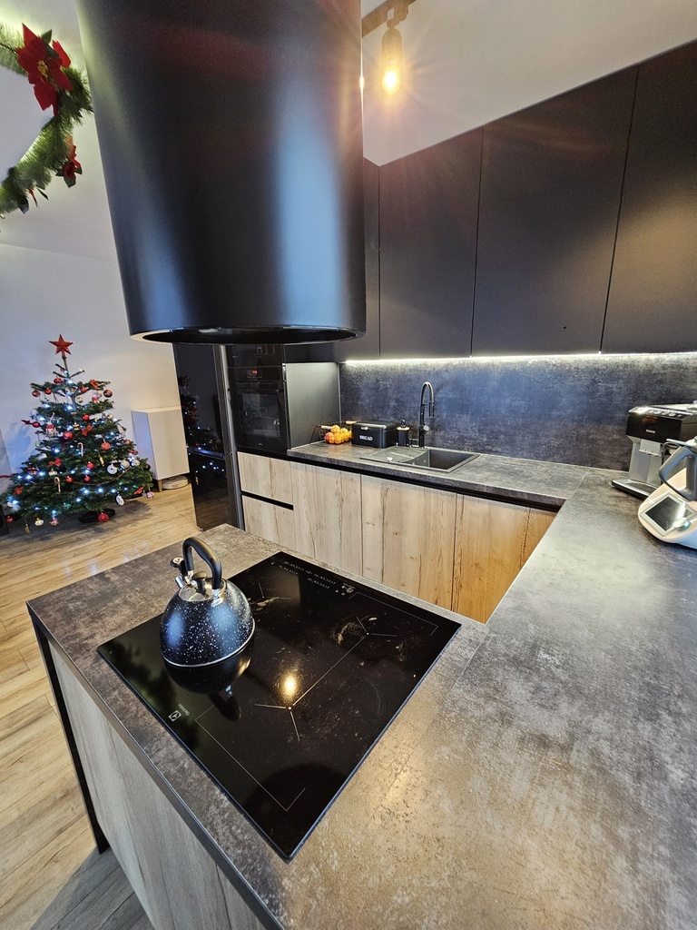- przestronnego i salonu z otwartą kuchnią, wyposażoną w nowoczesną zabudowę kuchenną wraz ze sprzętem AGD w zabudowie (lodówka, zmywarka, płyta indukcyjna, piekarnik i mikrofalówka) z salonu jest wyjście na balkon o powierzchni ok 7m2