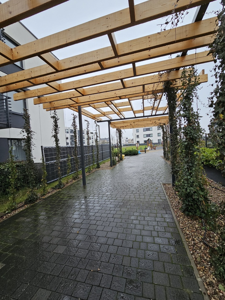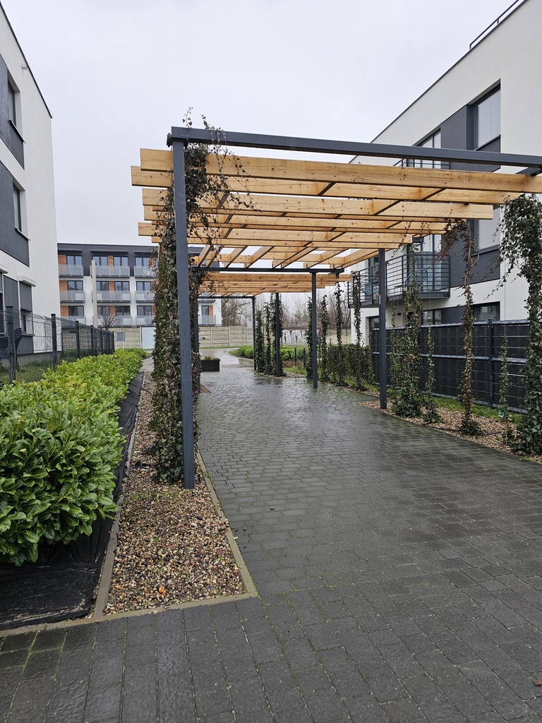 Osiedle posiada place zabaw dla dzieci oraz tereny zielone wraz z małą architekturą w tym pasaż spacerowy z pergolą i zielonymi ścianami łączącymi wszystkie etapy inwestycji.