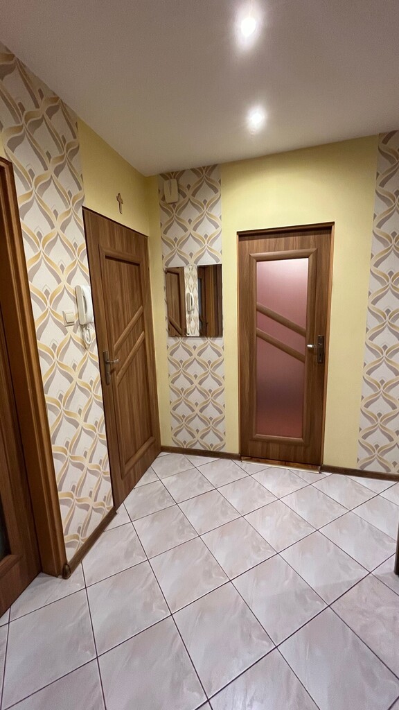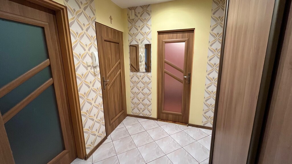 Na podłodze drewniany parkiet (w dobrym stanie) i kafle, na ścianach tapety. Łazienka z kabiną prysznicową wykończona w glazurze i terakocie.