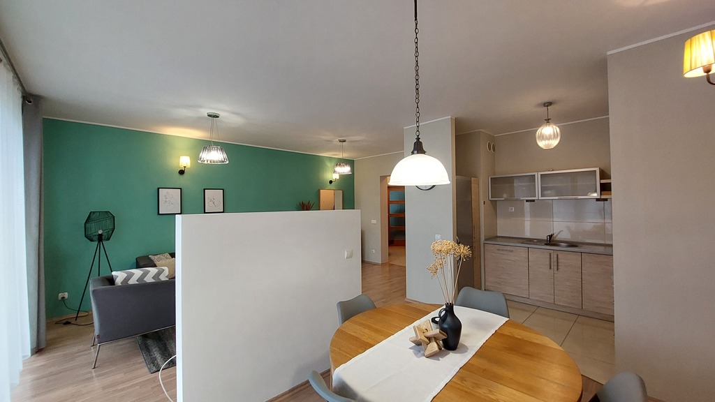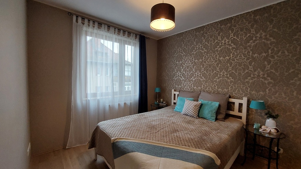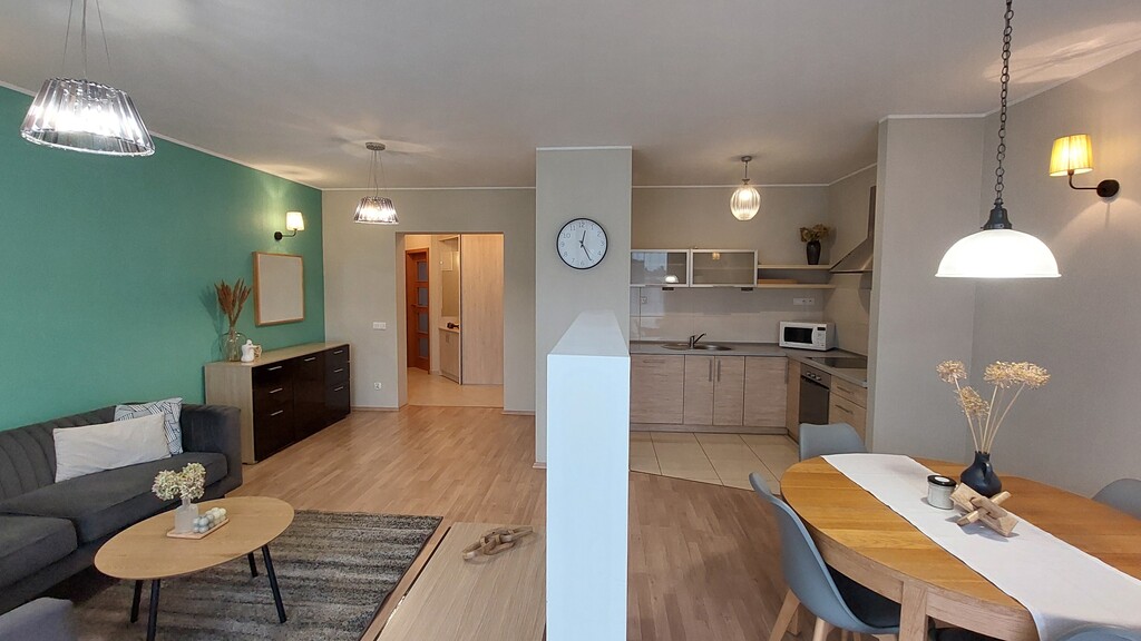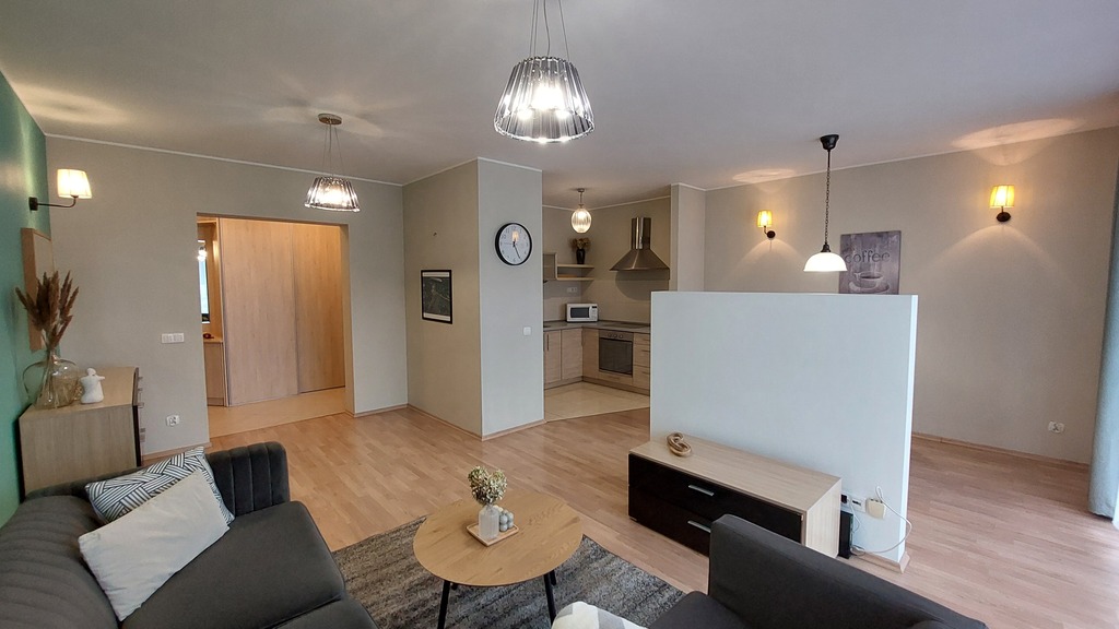 Na powierzchni ponad 65 m2 mamy duży salon z aneksem kuchennym i częścią jadalnianą, 2 sypialnie, przedpokój oraz łazienkę razem z WC.