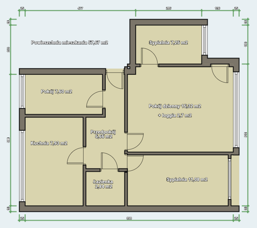 Na całkowitą powierzchnię użytkową mieszkania, tj. 57,67 m2 składa się:
