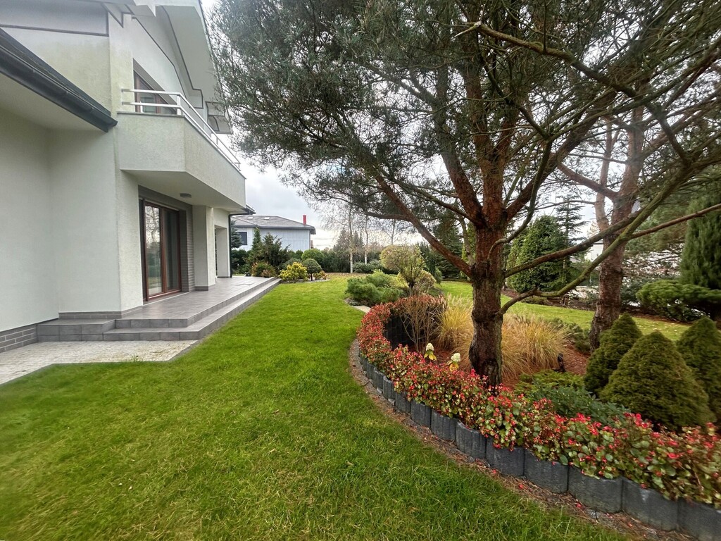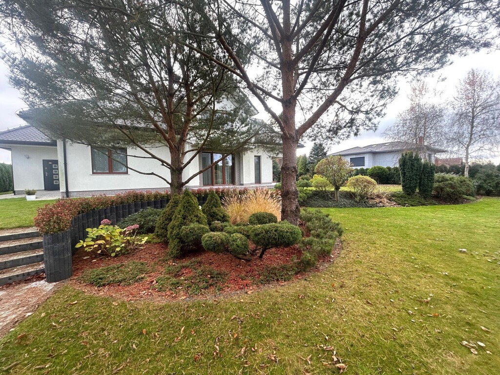 pięknie zagospodarowany, idealnie dopasowany do rosnących już wcześniej na działce drzew, starannie utrzymany i systematycznie pielęgnowany.