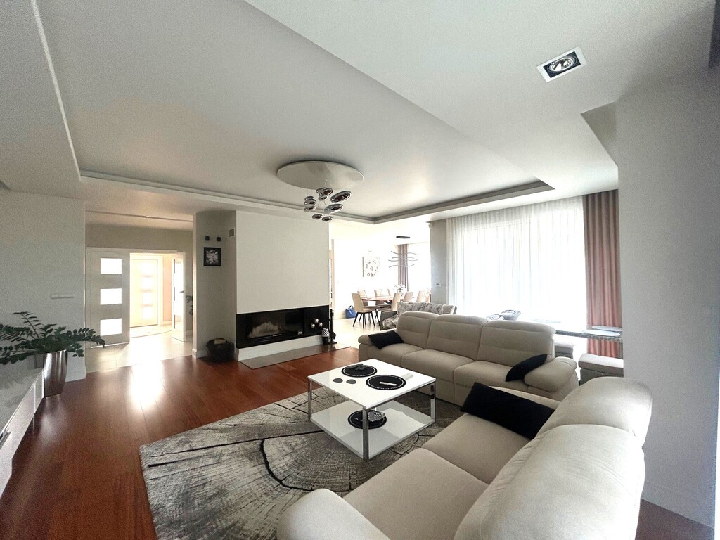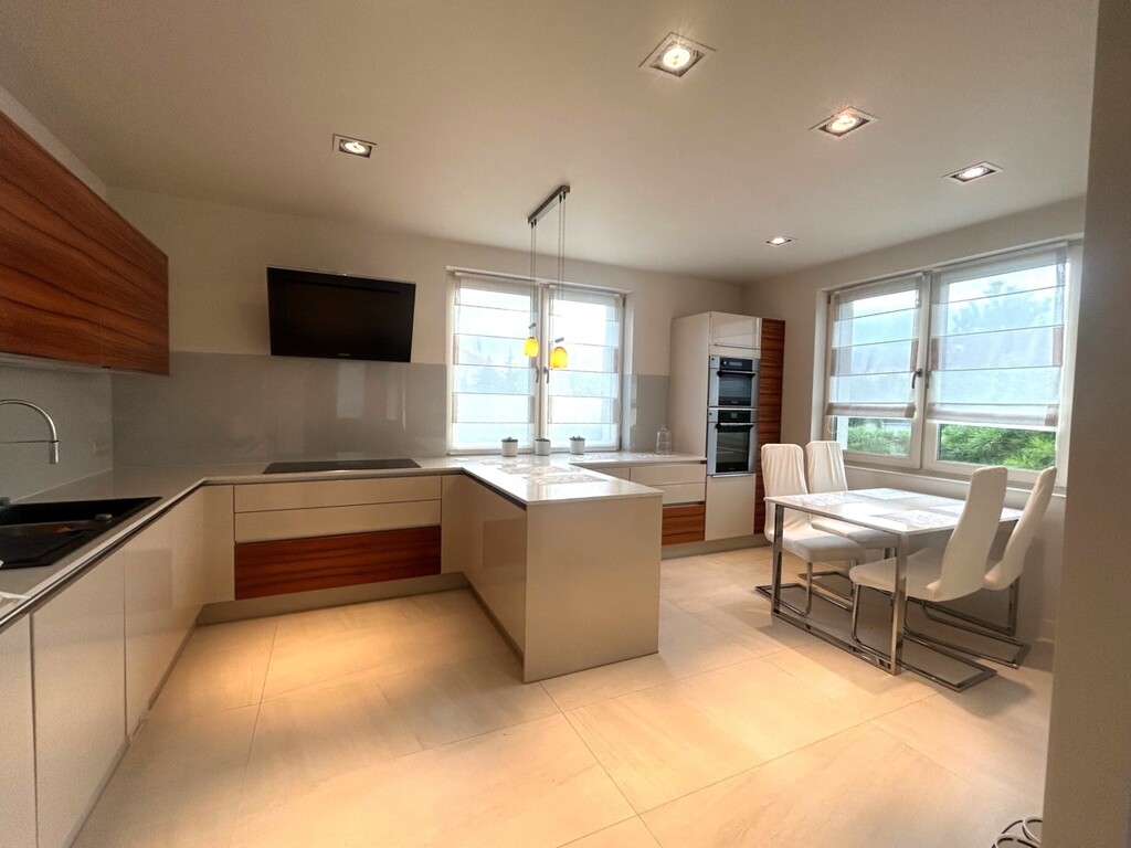 Dom oddany do użytkowania w 2013 roku, wybudowany w technologii tradycyjnej, wykończony materiałami wysokiej jakości, utrzymany w bardzo dobrym stanie. Nowoczesna bryła architektoniczna idealnie wkomponowana w otaczającą ją przestrzeń. Dachówka ceramiczna (izolacja termiczna: wełna mineralna 30 cm), ściany zewnętrzne budynku docieplone, okna PCV (parapety kamienne) z roletami zewnętrznymi i moskitierami, oraz okna drewniane - połaciowe. Dom dobrze doświetlony światłem dziennym.