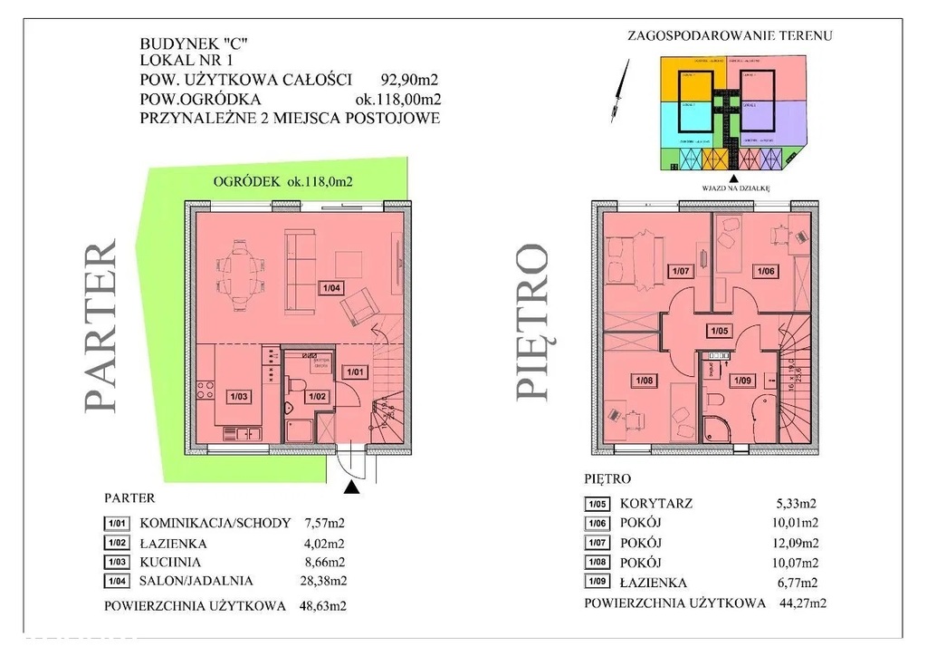 Budynek o powierzchni 92,9 m2 z dużym salonem z aneksem kuchennym i miejscem na jadalnię, 3 sypialniami i 2 łazienkami, a także strychem jako pomieszczeniem magazynowym (podłoga z płyt OSB, właz z drabinką).