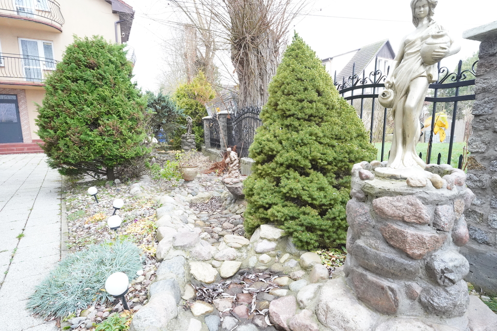 Cała posesja ładnie zagospodarowana z licznymi krzewami , altanami, placem zabaw dla dzieci oraz miejscem do grillowania.