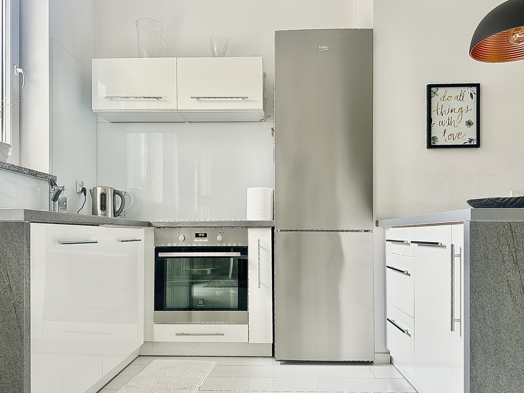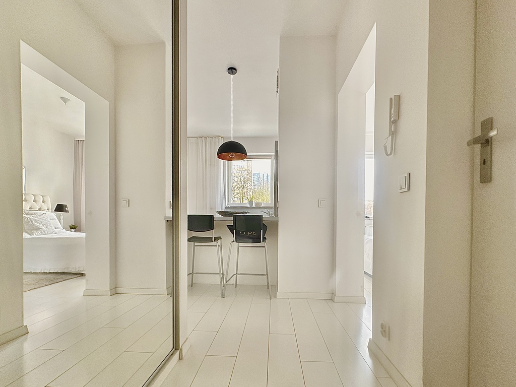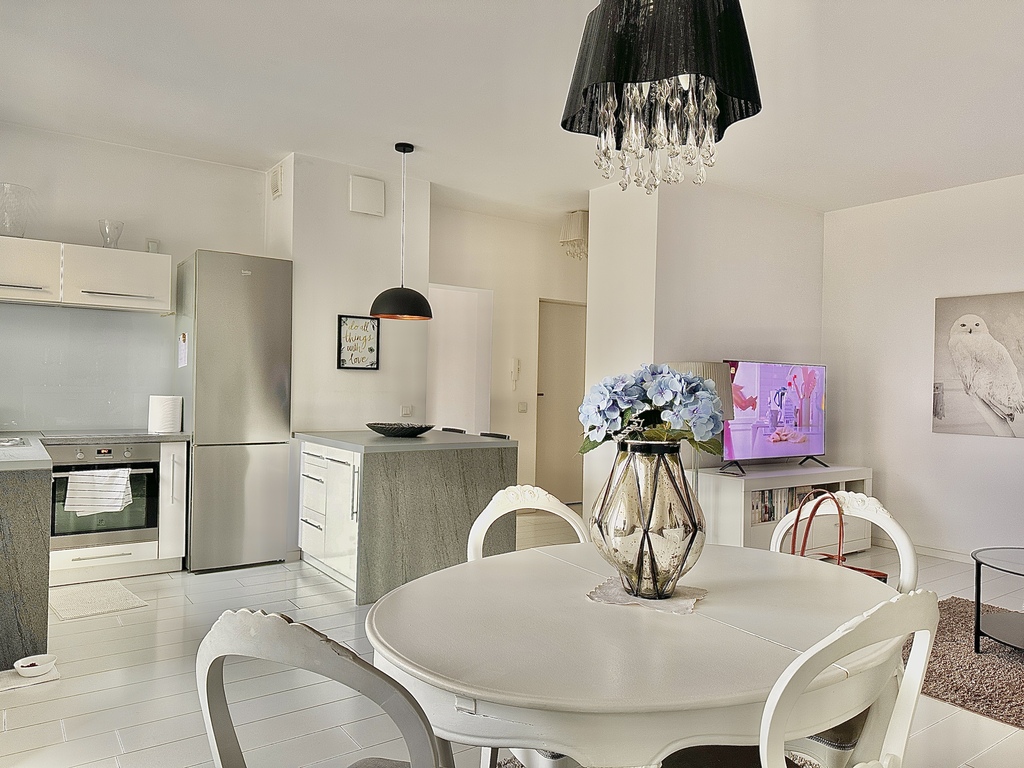 Apartament został wykończony materiałami najwyższej jakości, z dbałością o każdy szczegół. Jest sprzedawany w pełni umeblowany i wyposażony, co pozwala na wprowadzenie się od razu po zakupie.