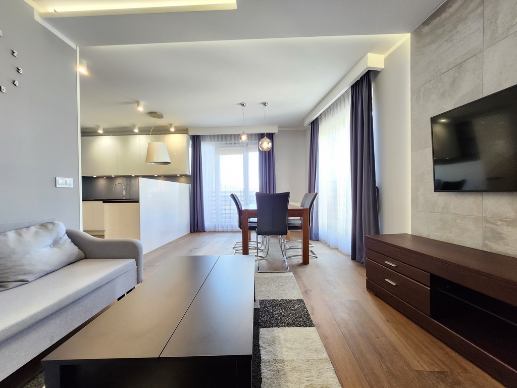 Na powierzchnię nieruchomości składają się przestronny salon z kuchnią w aneksie o pow. ok. 34 m2 z wyjściem na balkon, dwie sypialnie o pow. ok. 21,5 ( z garderobą) i 12,5 m2, duża łazienka z WC oraz korytarz.