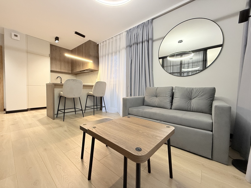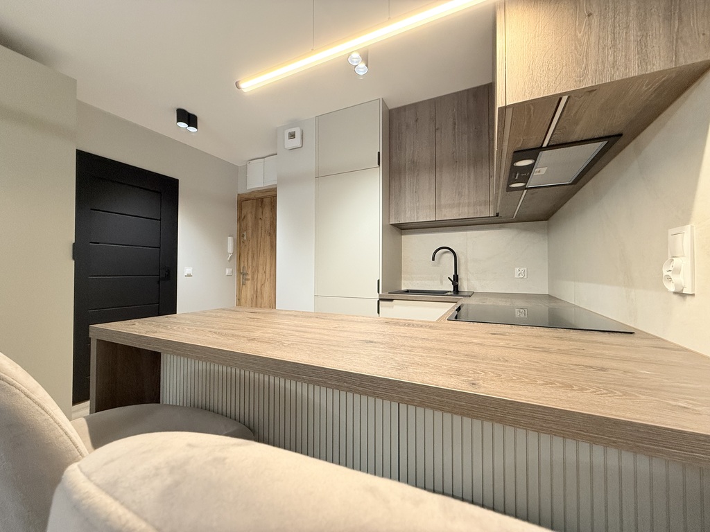 Pokój z pełni wyposażonym aneksem kuchennym tworzący główną część mieszkania, oddzielona szklaną ścianą część sypialniana, gustownie urządzona łazienka oraz korytarz.
